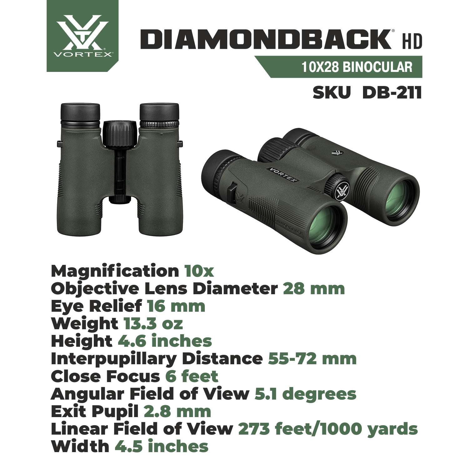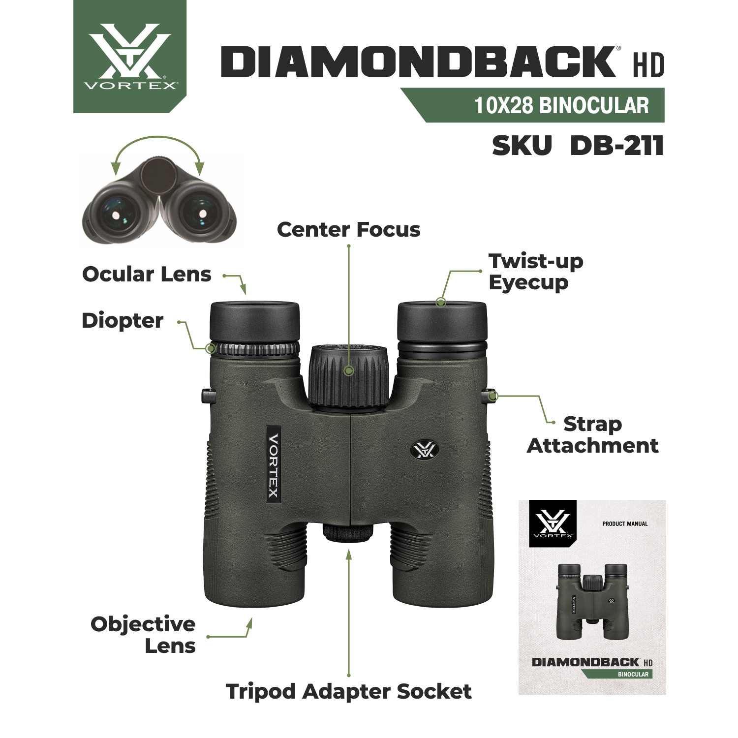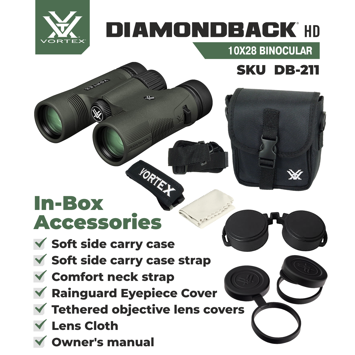 In The Box Vortex Optics DB-211 Diamondback HD 10x28 Binocular (Bundle Options Available. Choose Your Bundle Option):