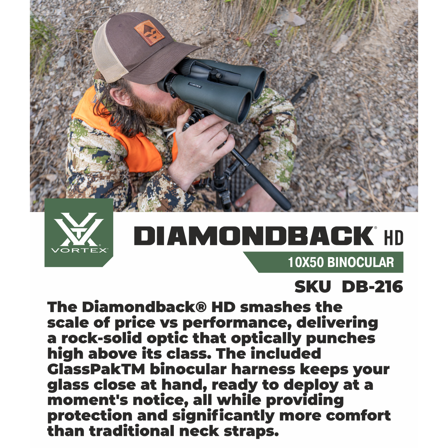 The Diamondback HD smashes the scale of price vs performance, delivering a rock-solid optic that optically punches high above its class. The included GlassPakTM binocular harness keeps your glass close at hand, ready to deploy at a moment's notice, all while providing protection and significantly more comfort than traditional neck straps.
