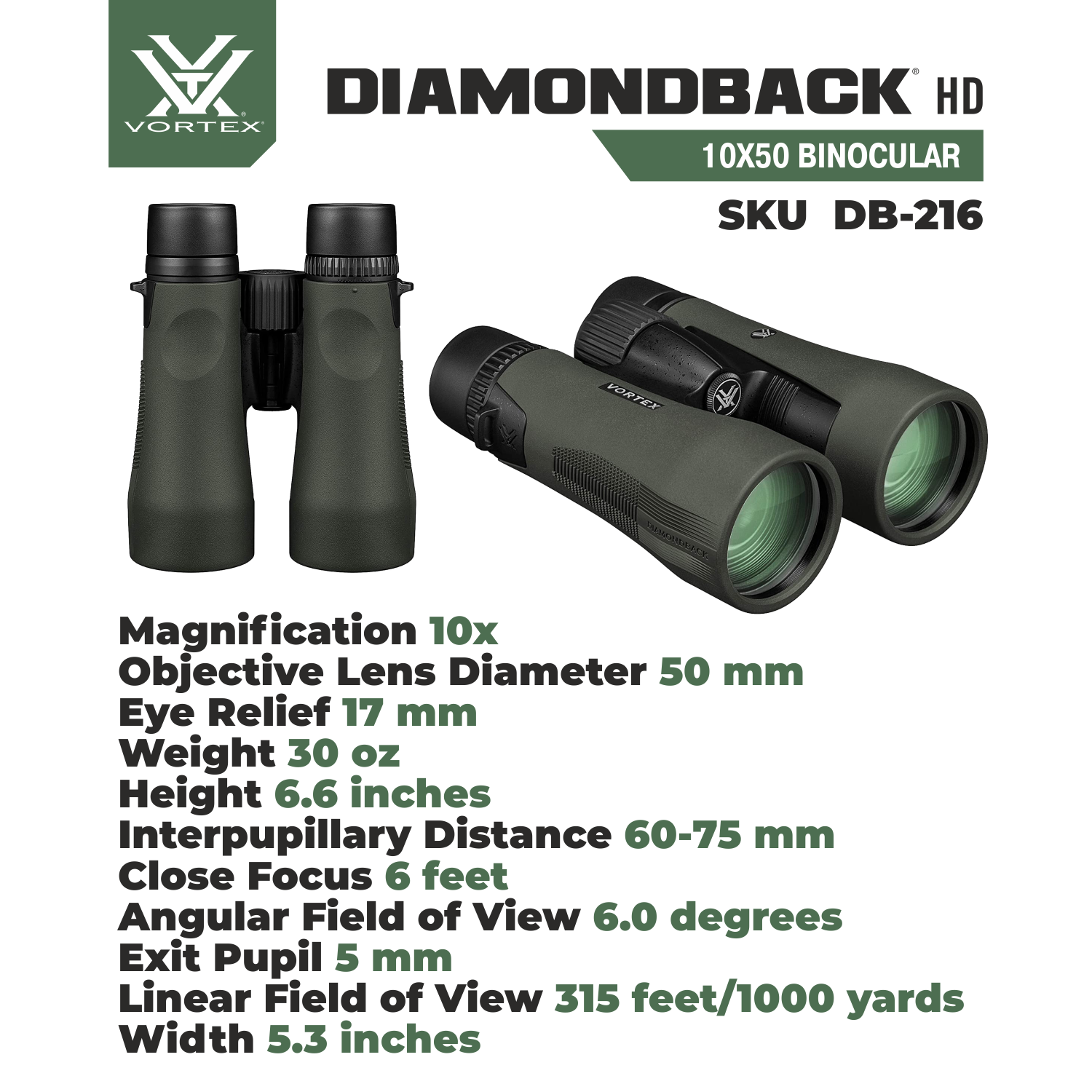 Vortex Optics Diamondback HD 10x50 Binocular Specifications: