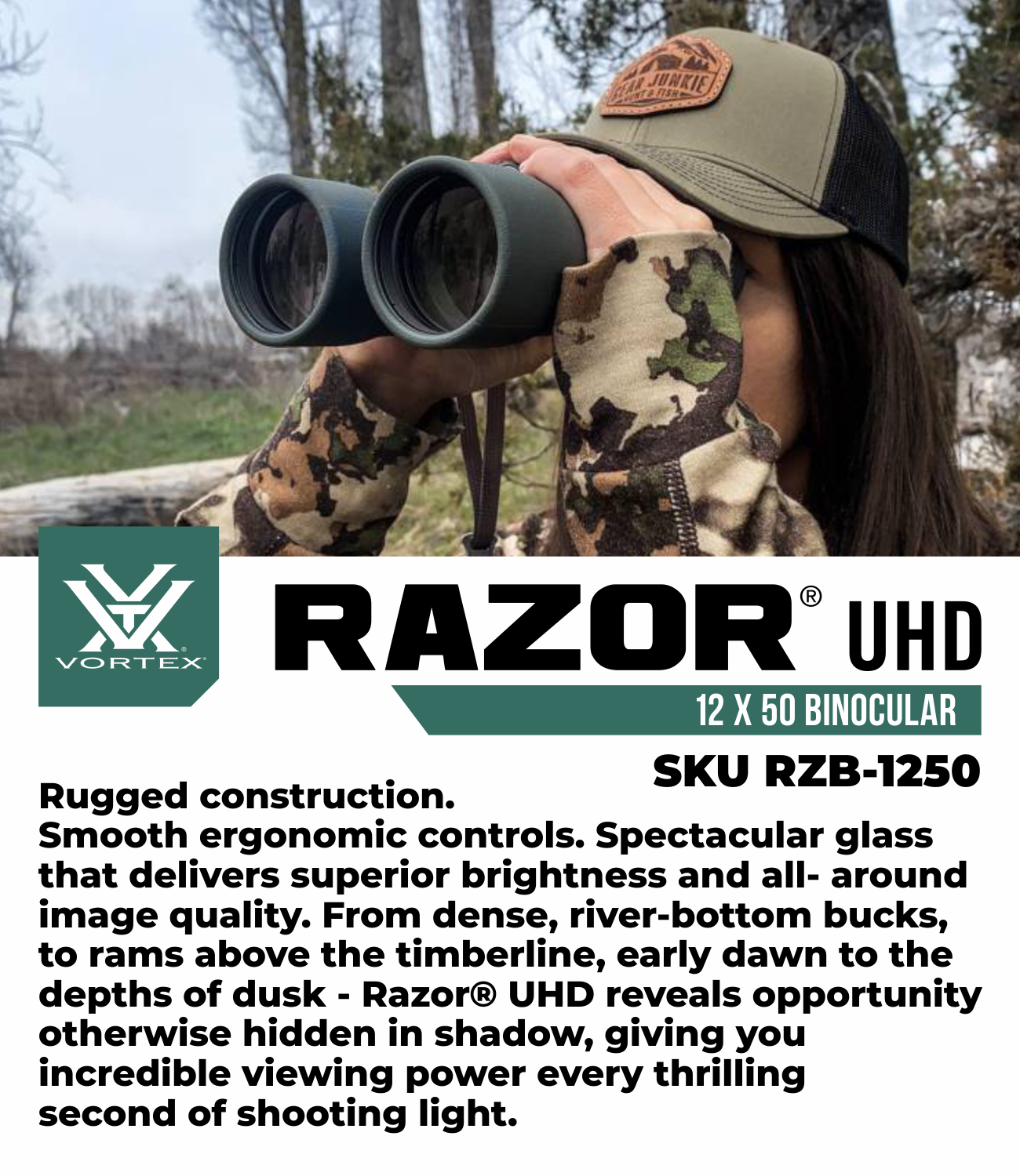 For those who know unforgettable moments don’t happen by chance, Razor UHD stands at the peak of the Vortex optics technology—delivering the unmatched clarity and low-light performance once-in-a-lifetime hunts demand. Rugged construction. Smooth ergonomic controls. Spectacular glass that delivers superior brightness and all- around image quality. From dense, river-bottom bucks, to rams above the timberline, early dawn to the depths of dusk—Razor UHD reveals opportunity otherwise hidden in shadow, giving you incredible viewing power every thrilling second of shooting light.