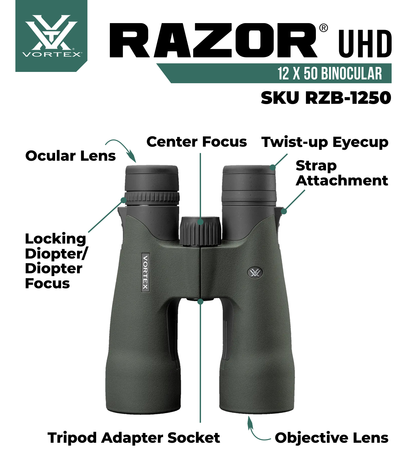 In The Box Vortex Optics Razor UHD 12x50 Waterproof Binocular (RZB-1250) (Bundle Options Available. Choose Your Bundle Option):