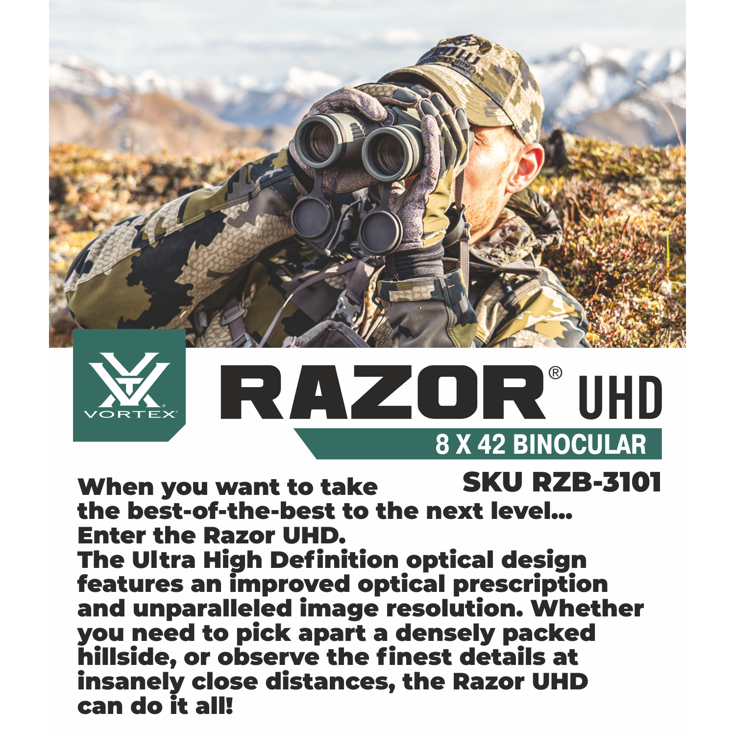 When you want to take the best-of-the-best to the next level... Enter the Razor UHD. The Ultra High Definition optical design features an improved optical prescription and unparalleled image resolution. Whether you need to pick apart a densely packed hillside, or observe the finest details at insanely close distances, the Razor UHD can do it all!