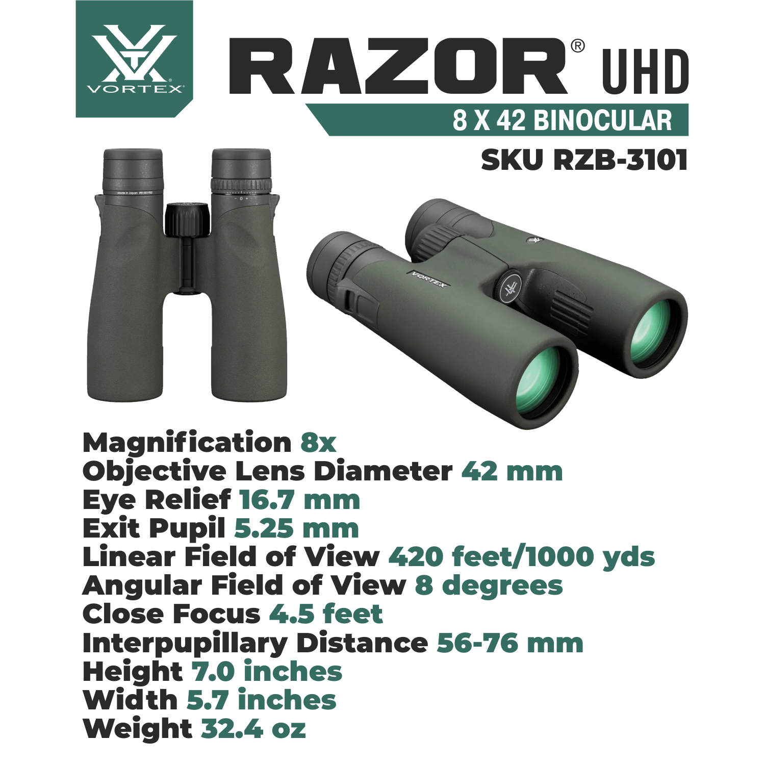 Vortex Optics Razor UHD 8x42 Binocular RZB-3101 Specifications: