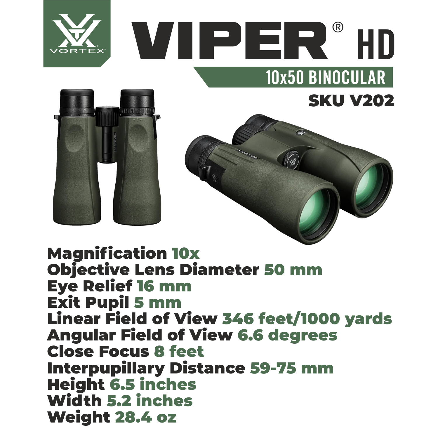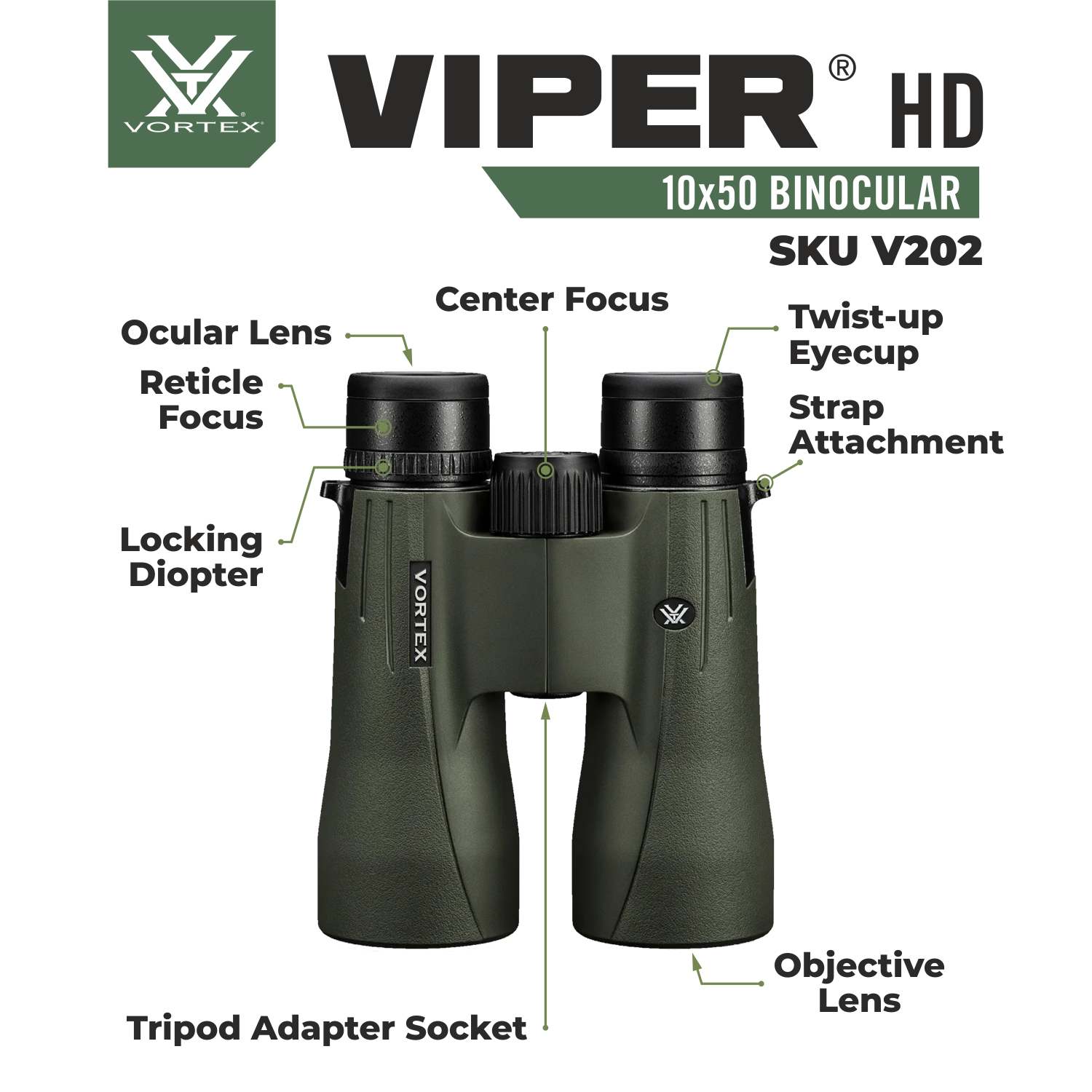 In The Box: Vortex Optics Viper HD 10x50 Roof Prism Binocular V202 (Bundle Options Available. Choose Your Bundle Option)