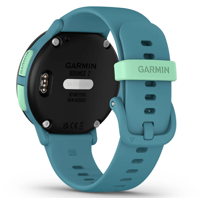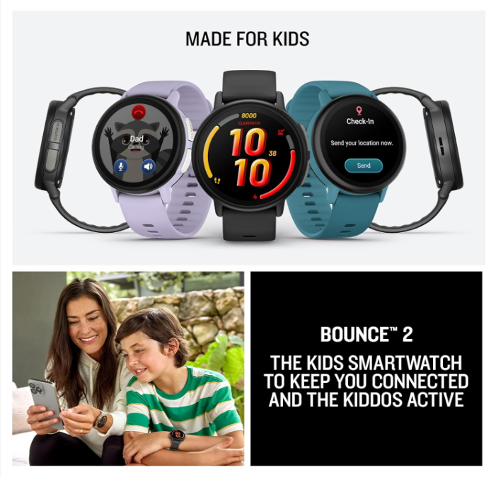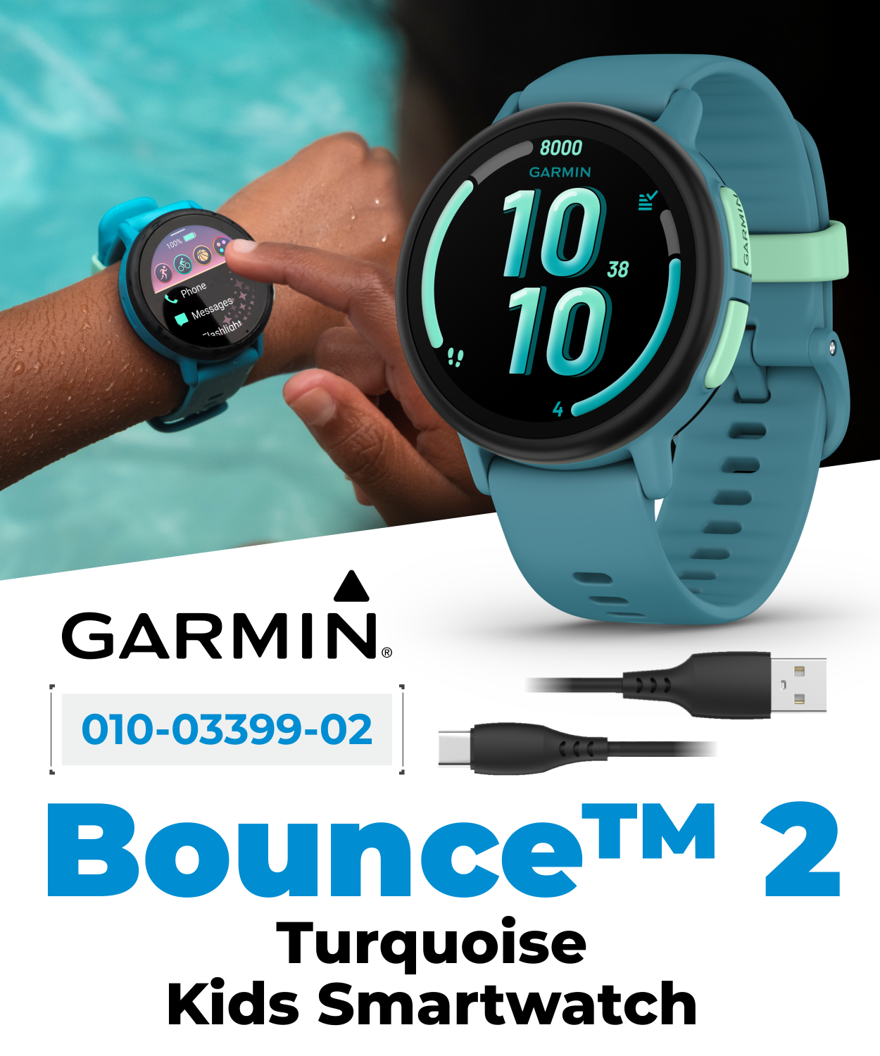 - IN THE BOX (Smartwatch Only): 1x Garmin Bounce 2 Kids Smartwatch, 1x charging/data cable, documentation