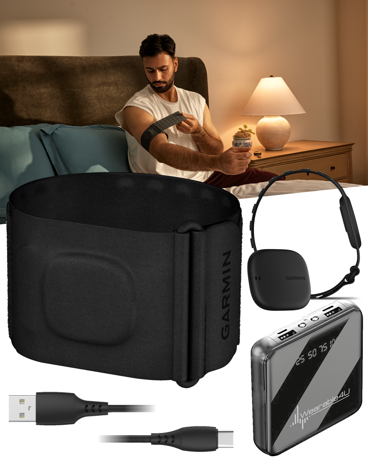- IN THE BOX (+Power Bank): 1x Garmin Index Sleep Monitor (S/M or L/XL); 1x charging/data cable; documentation; 1x Wearable4U PowerBank