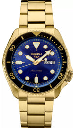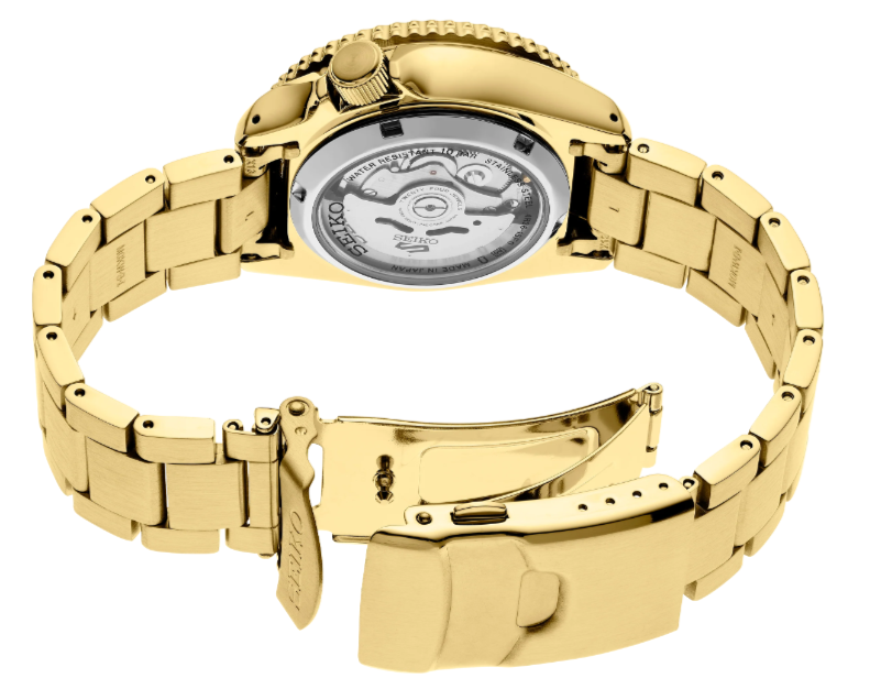 Seiko 5 Sports U.S. Special Creation. Adding new richness to classic sport/dress design, this stylish watch delivers all-day versatility with a cutting edge. Providing automatic technology that you control with every movement, this dynamic timepiece is powered by a 24-jewel movement that beats at a frequency of 21,600 vibrations per hour, with a power reserve of approximately 41 hours and manual winding capability. Framed by a gold uni-directional rotating elapsed timing bezel, the blue dial features luminous hands and markers, and a date/day calendar. Crafted of stainless steel in gold finish, this exceptional watch includes a tri-fold push button release clasp with lock, as well as a screwdown see-through caseback for a view of classic timekeeping in action. 10 bar, 100M Water Resistant