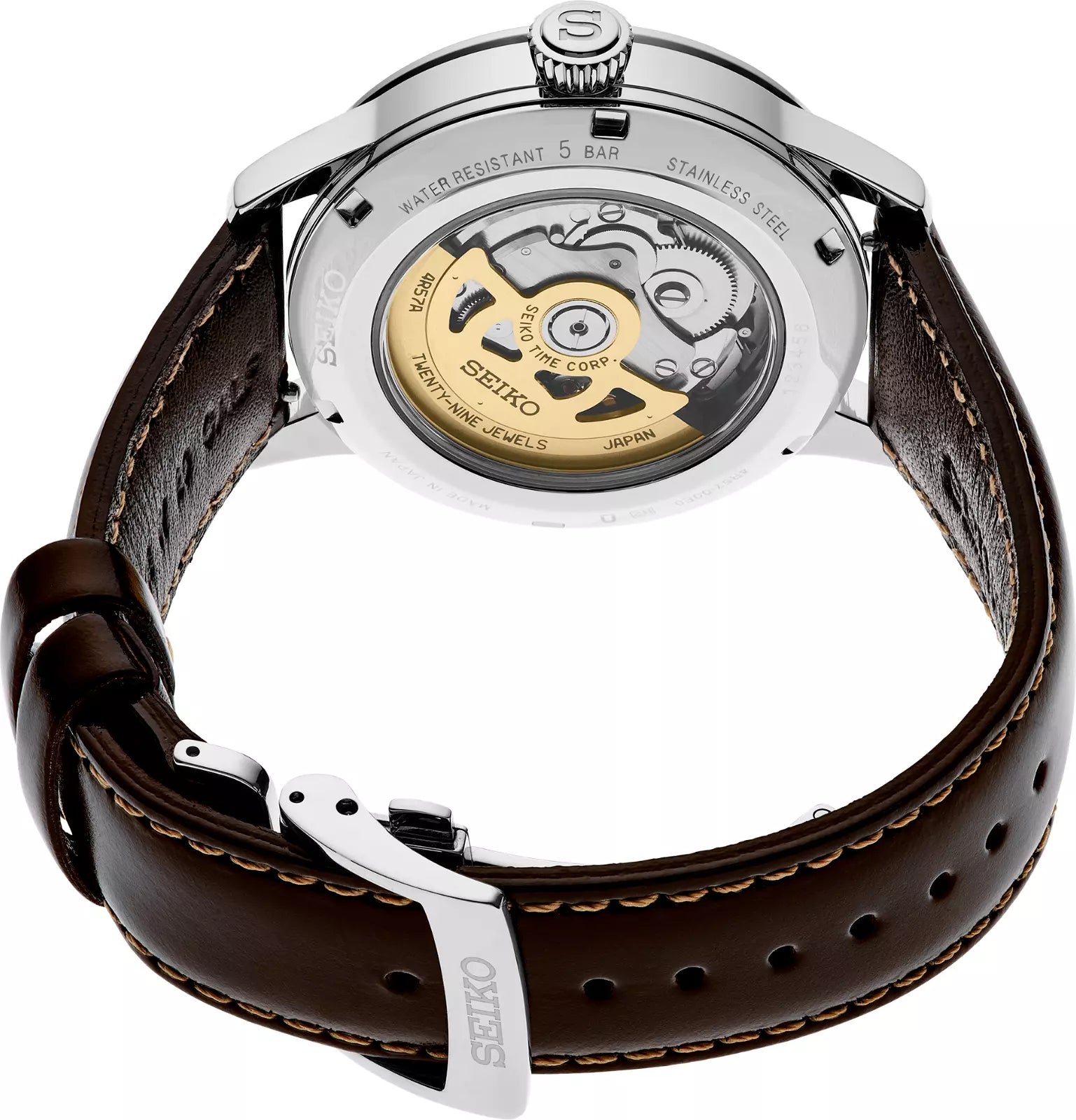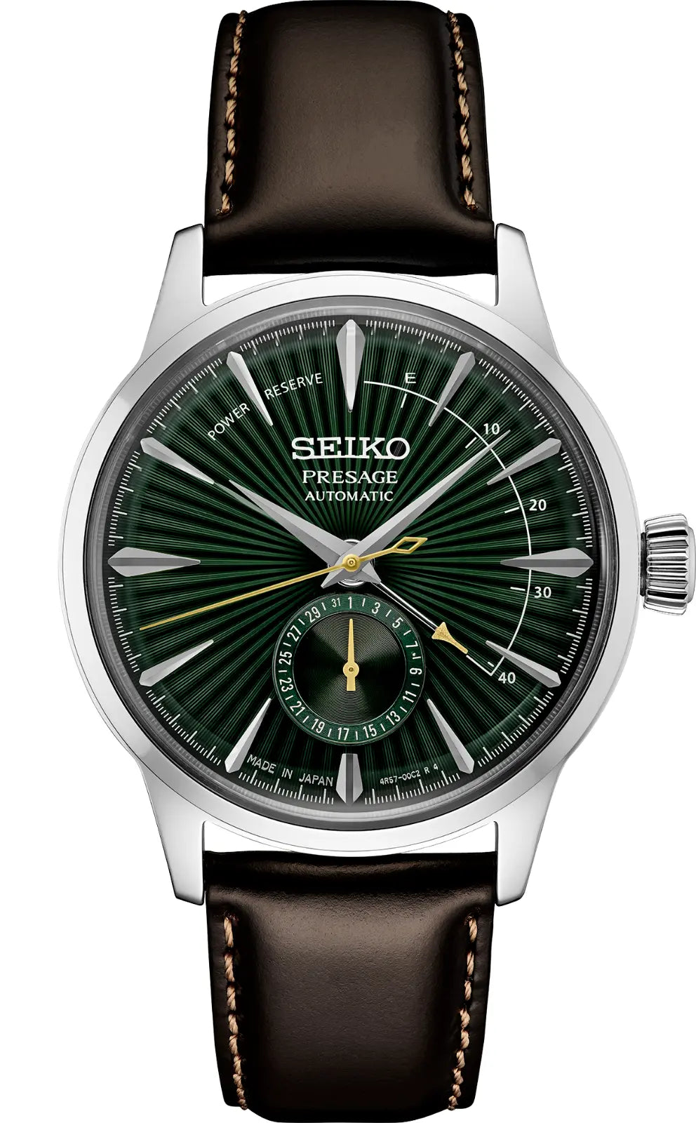 Seiko Presage Cocktail Time. Offering the finest in Japanese mechanical watchmaking, the Presage Collection blends precision technology with superior craftsmanship and design. Inspired by the vibrance of the city’s modern lounges, the newest Cocktail Time designs express the excitement of today’s Tokyo, with fresh styling and colors. Highlighted by a rich green dial with pressed pattern and gloss finish evoking the Mockingbird cocktail, this elegant design includes a power reserve indicator and date subdial. The 29-jewel automatic movement, with manual winding capability, beats at a frequency of 21,600 vibrations per hour, with a power reserve of approximately 41 hours. Crafted of stainless steel, with brown leather strap, this distinctive timepiece includes a box-shaped crystal, screwdown see-through caseback, and tri-fold push button release clasp. 5 bar, 50M Water Resistant