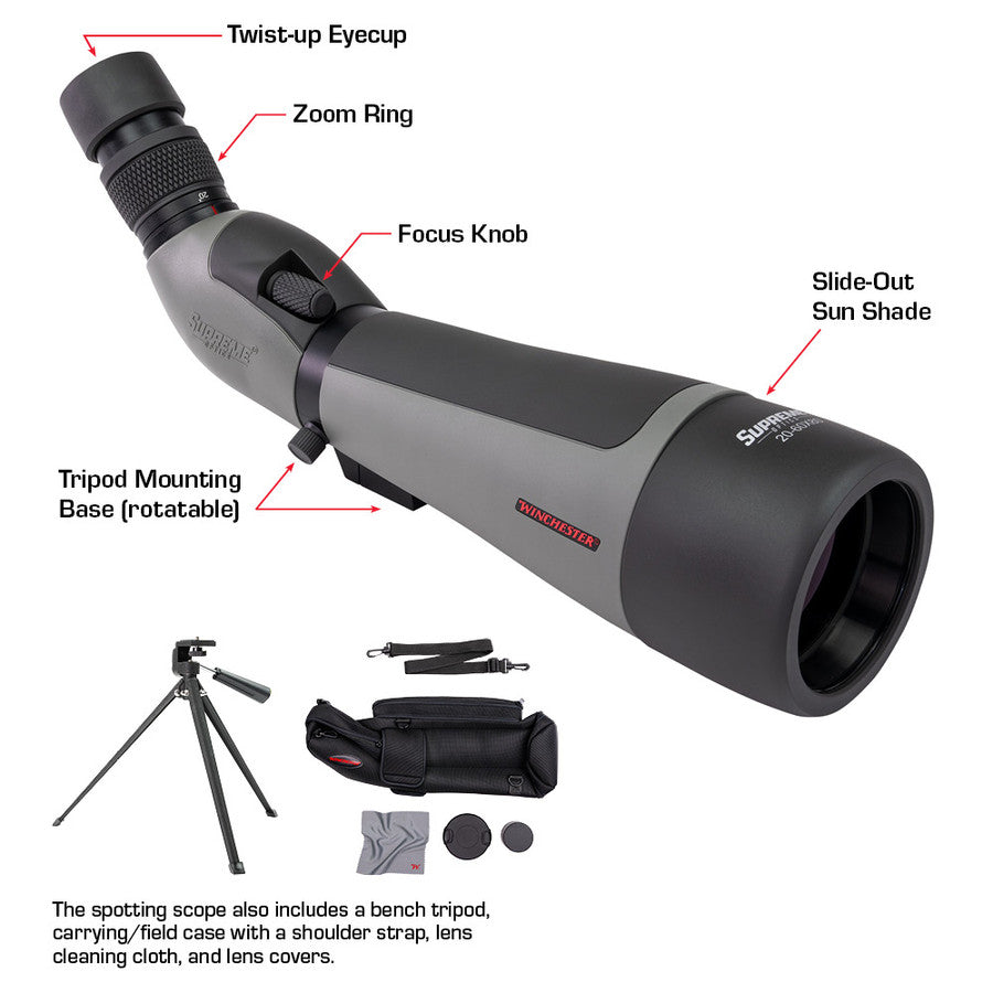 Winchester Supreme spotting scopes incorporate brilliant fully multicoated glass that transmits intense colors and crisp detail, even in low light conditions. Color-saturated images with razor-sharp contrast and clarity that make the smallest details come to life. A smooth focus dial allows precise adjustments to define fur, feathers or antlers at extreme distances, and a large magnification range means your 100% waterproof spotter is perfect for all your outdoor adventures. A rotating collar positions the scope for maximum comfort and utility on the bench or in the field. Light weight and ergonomic, your Winchester Supreme spotting scope comes with a bench top tripod and a quality protective case designed for field use and carry.