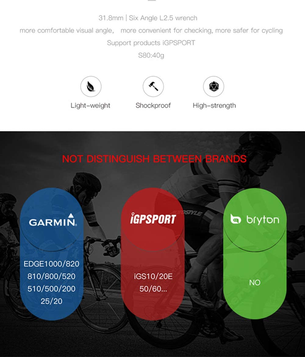 The standard model of out front bike mount, with golden visual angle, makes riding more secure. Compatible with iGPSPORT bike computer and some GARMIN bike computer models, nylon-glass fiber composite material, ultra-light and impact resistant,it can stabilize the bike computer and view the data without worry even when used on bumpy non-paved road surface.