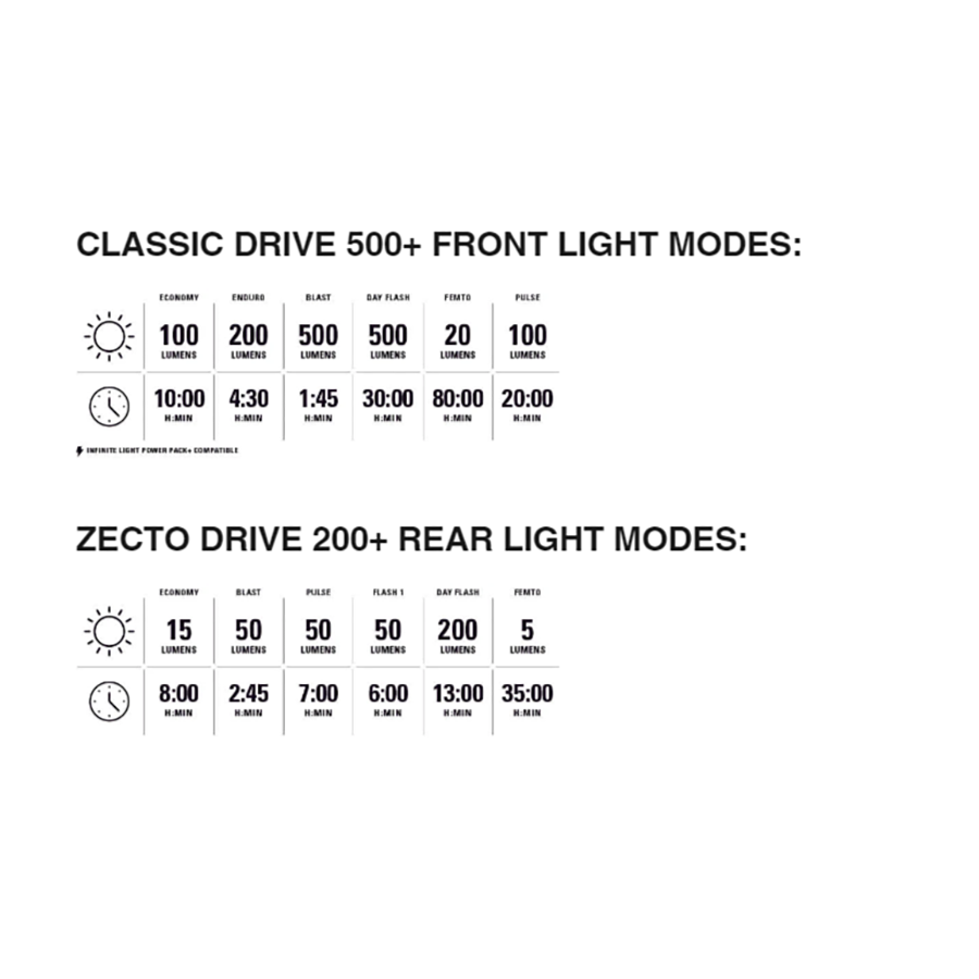 A classic bike light with a modern twist, the Classic Drive 500+ front light beams 500 lumens (up to 80 hours of runtime) via a single high-output LED emitter. It’s built around a sleep cylindrical housing that offers a compact and lightweight form factor. Its waterproof USB-C charging capability is convenient for recharging(cable not included). The machined aluminum construction ensures durability and efficient heat dissipation. Rigorously tested to IPX7 Waterproofing standards, it is built to withstand various weather conditions. Choose from six different output modes, from the highly disruptive Daytime Flash mode to the long-lasting 80-hour runtime in Femto Mode. The Infinite Light Power Pack+ compatibility offers versatility and extended runtimes. Features: IPX7, Daytime Flash, Infinite Light Power Pack+