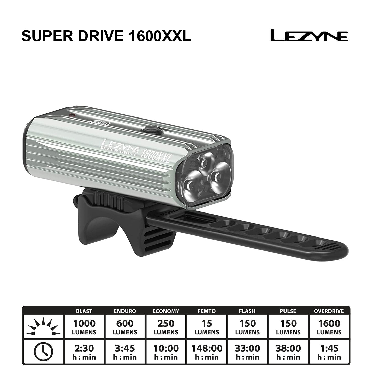 This high-powered bike light features three high output LEDs for up to 1600 lumens of output. It has seven modes and our Tri-Focus Optics optimizes light output - this creates an ideal beam pattern for high speed. Machined aluminum construction features cooling fins and cutouts for side visibility. The Super Drive 1600XXL is both Smart Connect and Remote Switch compatible for additional ease of use. An Auto Day/Night Sensor automatically adjusts lumen output while in select modes. The light is micro-USB rechargeable and it can run for up to a massive 148 hours on a full charge. A versatile strap secures it to all common handlebar sizes.