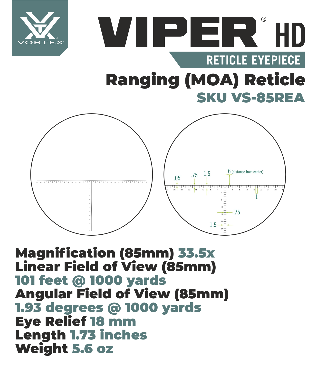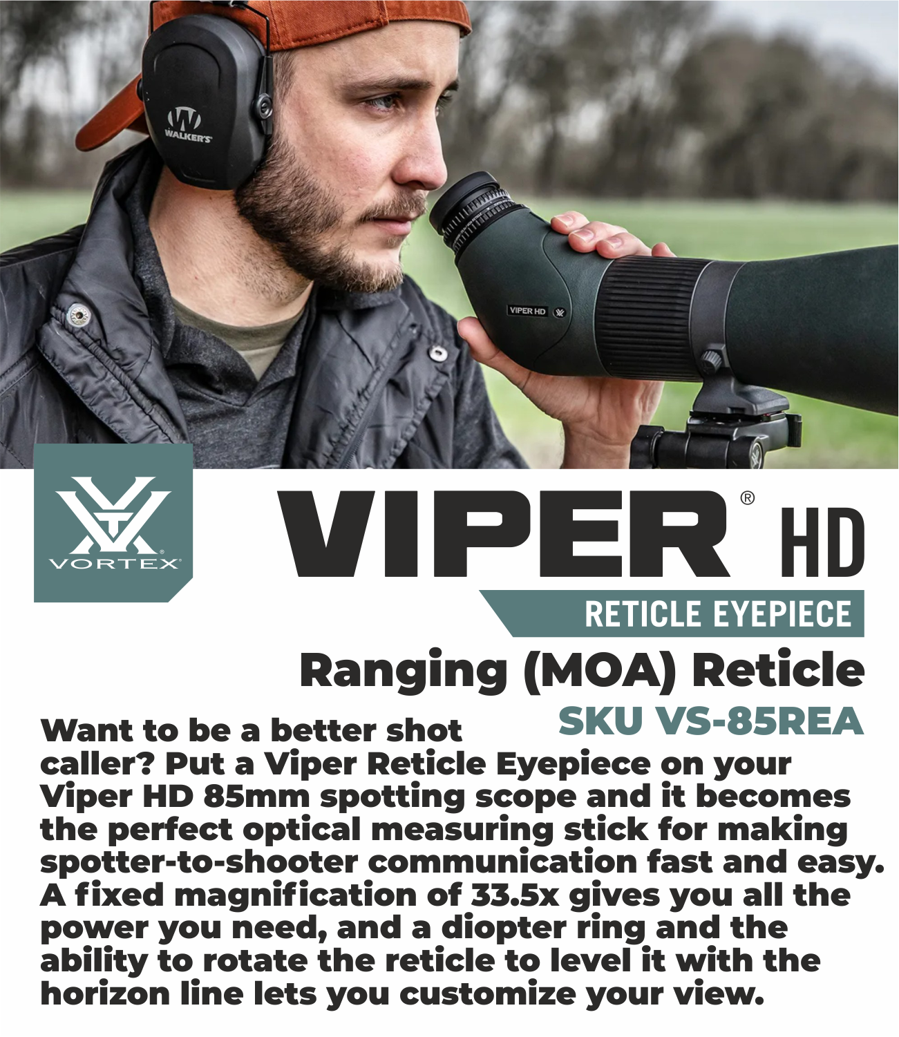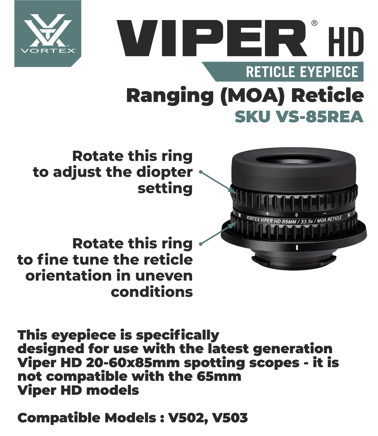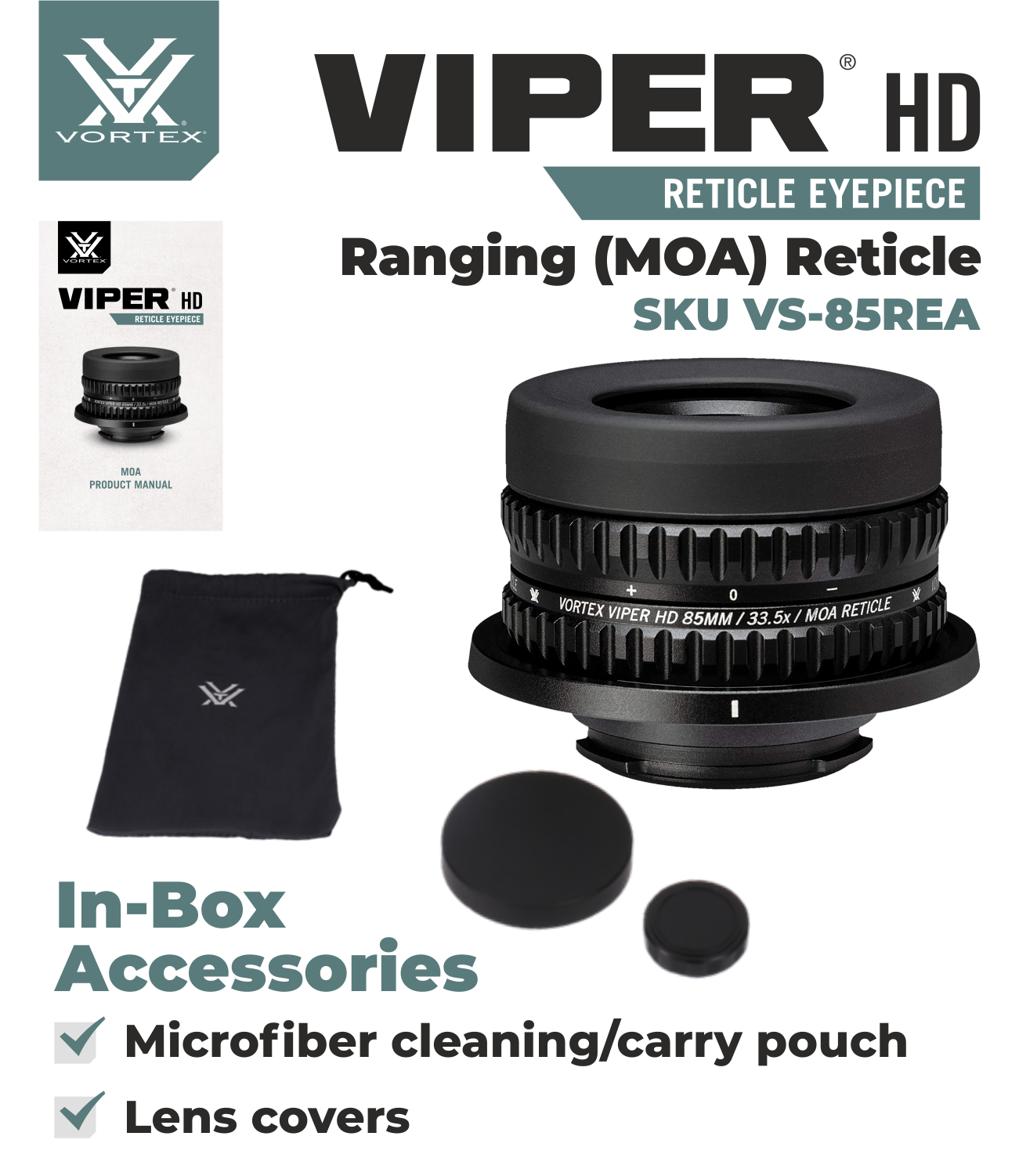 In The Box: Vortex Optics Viper HD 85mm Spotting Scope Reticle Eyepiece Ranging (MOA) (Bundle Options Available. Choose Your Bundle Option):