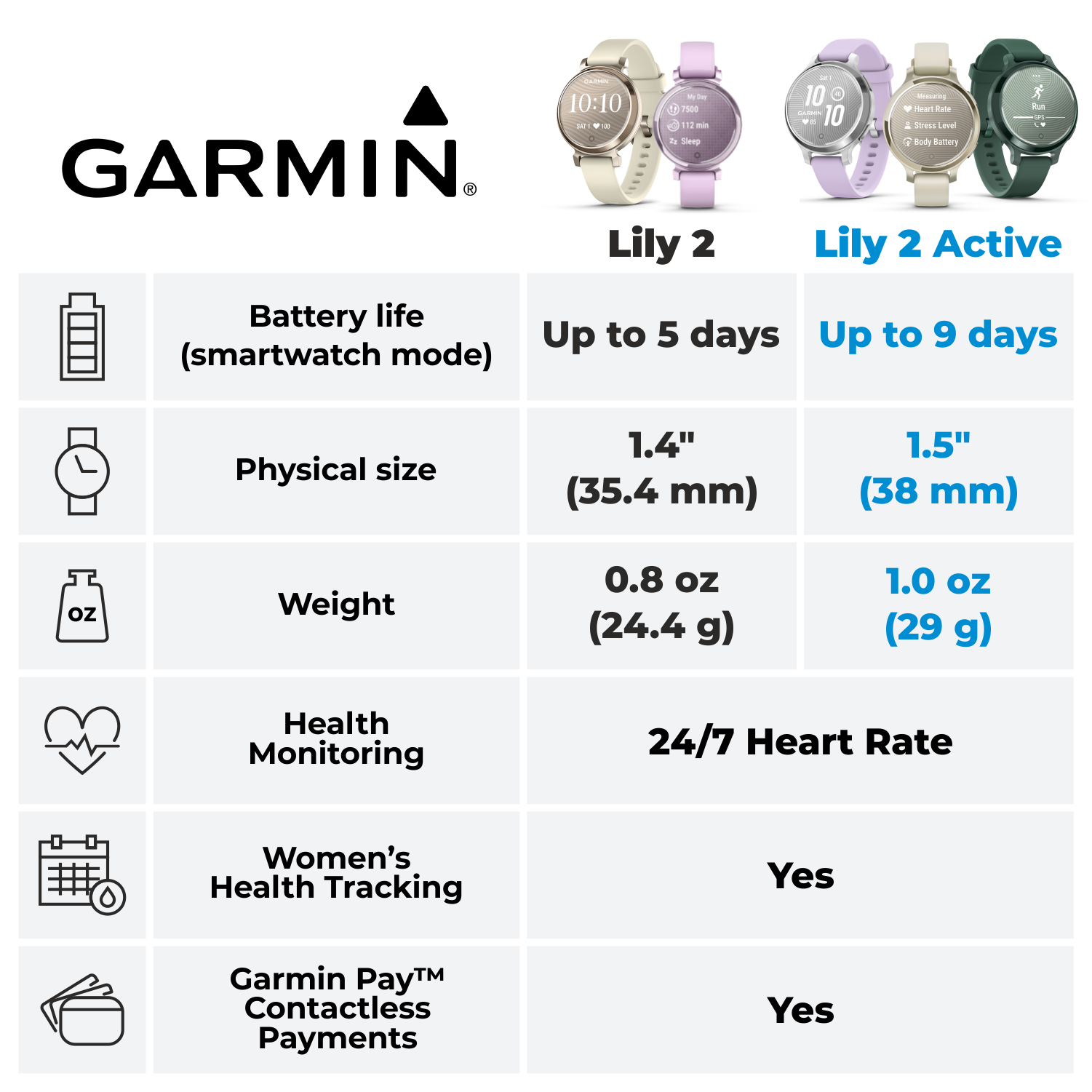 Trendy but unexpected — that’s Garmin Lily 2 Active, the small, stylish smartwatch. With a flick of your wrist, the stylish patterned lens lights up to reveal a bright touchscreen display. Built-in GPS lets you track your outdoor activities, including walks and runs. When paired to your smartphone, stay connected to what matters with call, text and email notifications right on your wrist. Lily even helps you tune in to your body by tracking steps, sleep, heart rate, energy levels, women’s health data and more (data presented is intended to be a close estimation of metrics tracked). And with a battery that lasts up to 9 days, the Lily 2 Active smartwatch helps you look good day in and day out.