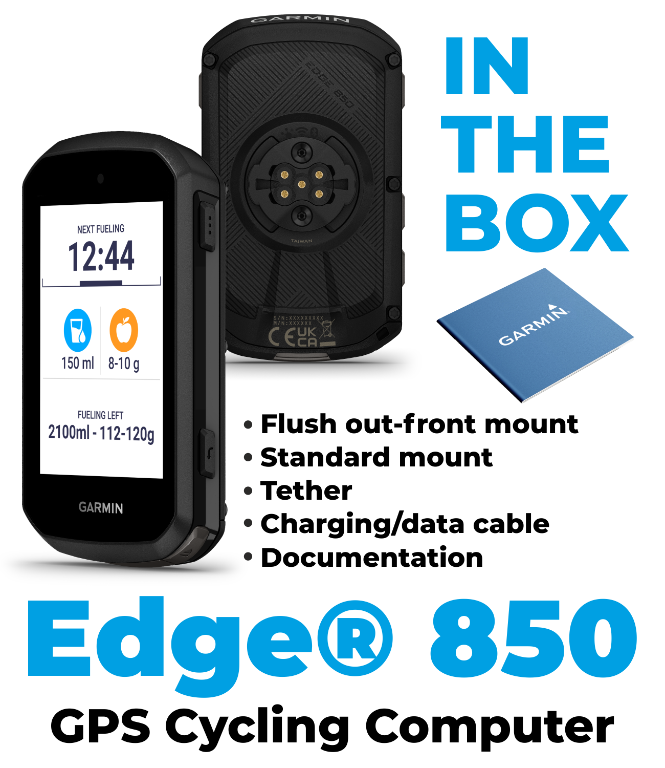 • IN THE BOX: 1x Garmin Edge 850 GPS cycling computer; Flush out-front mount; Standard mount; Tether; Charging/data cable; Documentation
