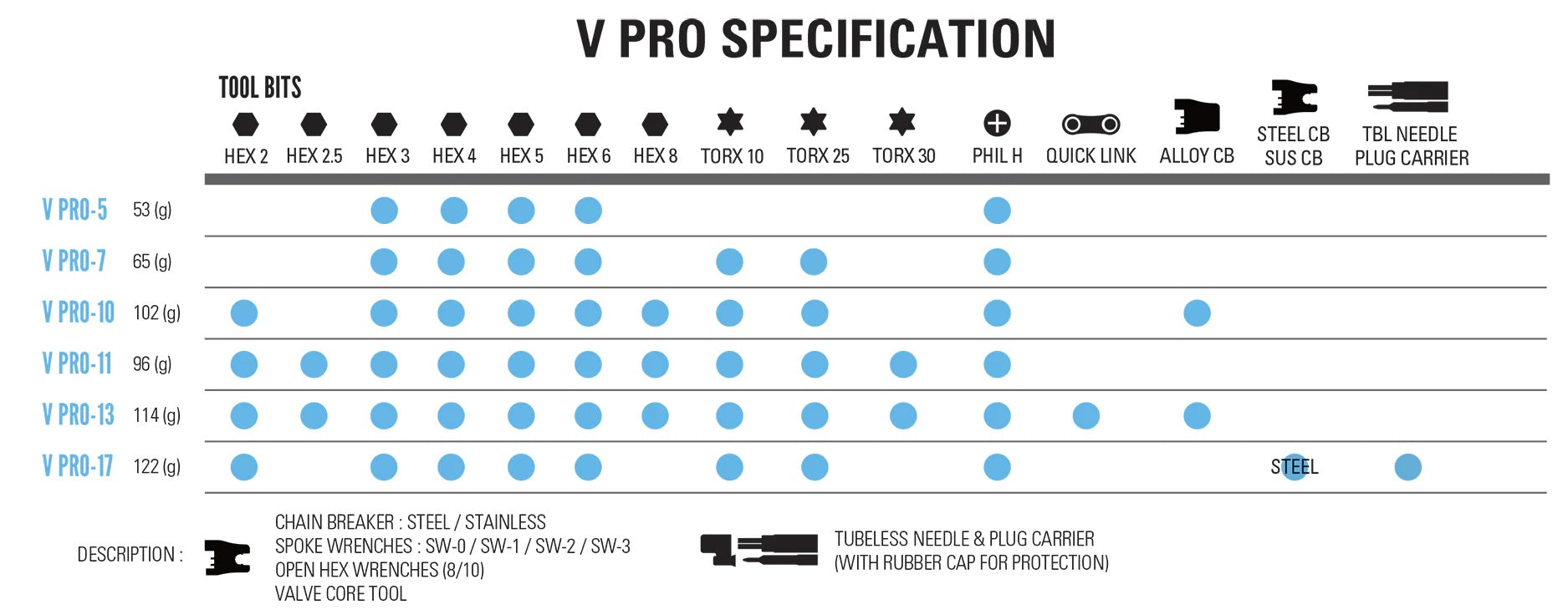 The V Pro bike multi-tool series includes a refined collection of tools developed for today’s modern bicycles. Each model is designed and manufactured in-house, engineered to efficiently repair most road or trailside mechanicals. The machined steel tool bits are now longer and introduce our Black Anti-Corrosion technology for superior corrosion resistance. The machined aluminum side plates are anodized black and deliver a compact, comfortable feel during use. With unmistakable Lezyne styling, the lightweight V Pro tools offer amazing value and functionality for all types of cyclists.