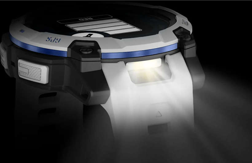 Additional features include a built-in LED flashlight with variable modes, Garmin Pay contactless payments (with supported banks), smart notifications, and compatibility with the Garmin Connect app for detailed insights, data tracking, and customization via the Connect IQ Store.