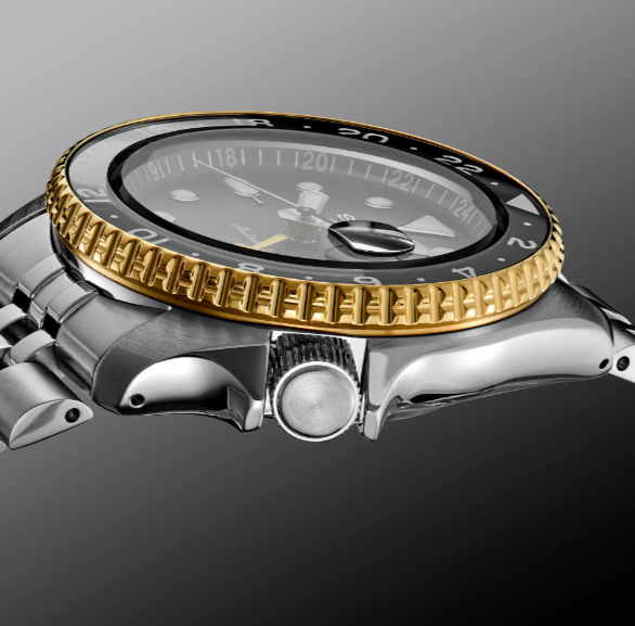 Seiko 5 Sports SKX GMT U.S. Special Creation. Adding new richness to classic sport/dress design, this stylish watch delivers all-day versatility with a cutting edge. With its GMT function and stylish five-row bracelet, this dynamic watch offers a new variation on the popular “SKX” style. Equipped with automatic technology that you control with every movement, this versatile timepiece is powered by a 24-jewel movement that beats at a frequency of 21,600 vibrations per hour, with a power reserve of approximately 41 hours and manual winding capability. The first SKX design to offer a two-tone case, this exceptional watch features a Charcoal gray dial with bold luminous hands and markers, and a magnified date calendar, as well as a large GMT hand with red accents for easy second time zone tracking. Crafted of stainless steel in two-tone finish, with a bi-color 24-hour GMT bezel, tri-fold push button release clasp and lock, and a screwdown see-through caseback for a view of classic timekeeping in action. 10 bar, 100M Water Resistant