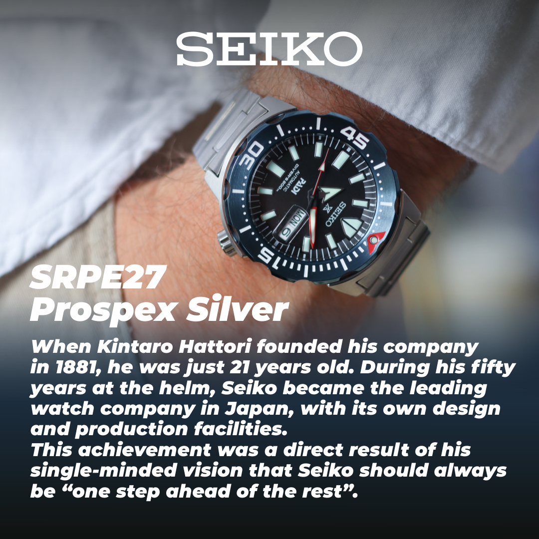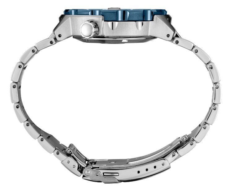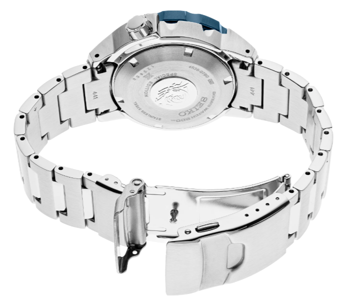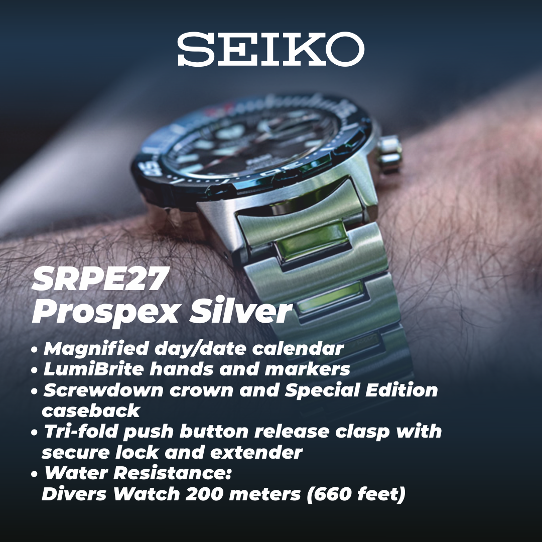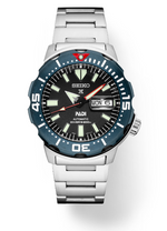 Prospex PADI Special Edition Automatic Diver. Designed for those who treat life as the ultimate adventure, the Seiko Prospex line meets every challenge with technological excellence and winning design. This Special Edition celebrates Seiko’s official partnership with PADI, the world’s leading scuba diver training operation, with the organization’s red and blue colors on its one-way rotating elapsed timing bezel and the PADI logo on the dial. Recalling Seiko’s most iconic diving styles, this distinctive watch features a unique case shape with grooved edges resembling teeth. In contrast to its powerful lines, the slightly smaller case recalls the landmark designs of the 1960s and ’70s. For reliable timing in rough waters, the 24-jewel automatic movement beats at a frequency of 21,600 vibrations per hour, with a power reserve of approximately 41 hours, and can be wound manually or automatically. The black dial includes a magnified day/date calendar and LumiBrite hands and markers. In stainless steel, with secure screwdown crown and caseback, and tri-fold push button release clasp with secure lock and extender, this high-intensity timepiece follows ISO standards for scuba diving. 200m Water Resistant