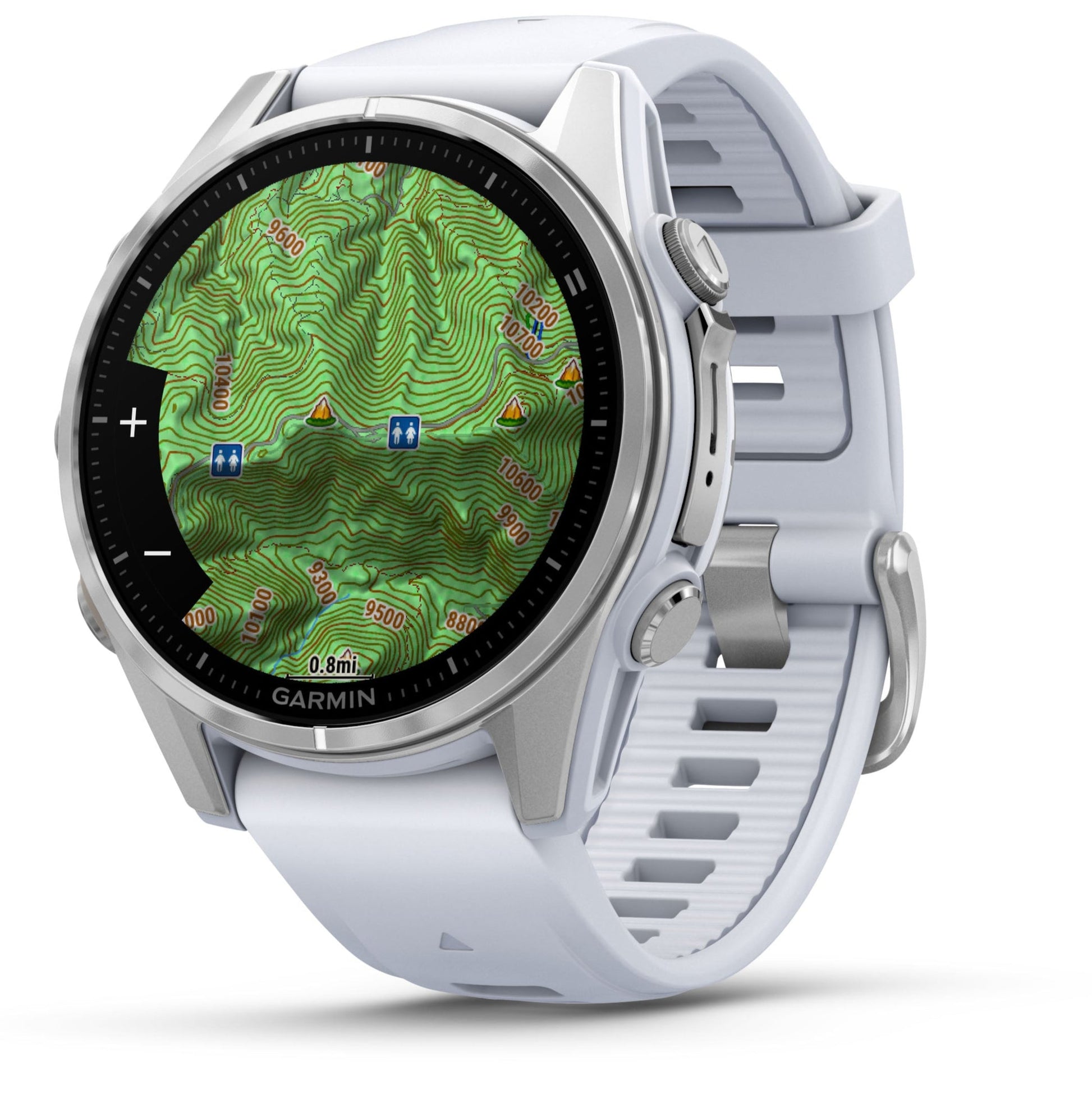 Be limitless. The fenix 8 multisport GPS smartwatch is built for serious athletes and outdoor adventurers who want to push beyond their limits. It features a bright 1.3” AMOLED display, stainless steel bezel and powerful built-in LED flashlight for after-dark visibility. A built-in speaker and mic enable you to make and take calls from your wrist when your watch is paired to your smartphone. Power up your body’s performance, endurance and resistance to injury with the latest in targeted strength training plans plus a full range of sport-specific workouts. Performance insights help manage your exertion and build stamina, while training readiness features show how much recovery time you need between workouts, based on 24/7 health and wellness monitoring of heart rate, respiration, stress, sleep and more (data presented is intended to be a close estimation of metrics tracked). Take to the trails with built-in ABC sensors and TopoActive maps that can be easily downloaded via Wi-Fi connectivity. The dynamic round-trip routing feature helps simplify the planning of your runs or rides — letting you set your target distance and receive turn-by-turn directions that adjust to get you back to your start on schedule. Enjoy extended off-grid adventures with up to 10 days of battery life in smartwatch mode. Plus, a 40-meter dive rating and leakproof metal buttons let you reach new depths of adventure. Additional features include music storage, Garmin Pay contactless payments (with a supported country and payment network), smart notifications (compatible smartphone required) and more
