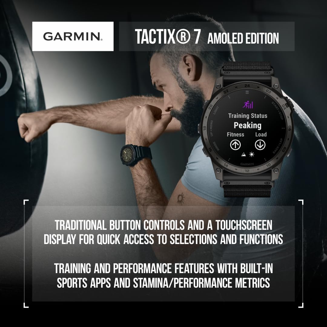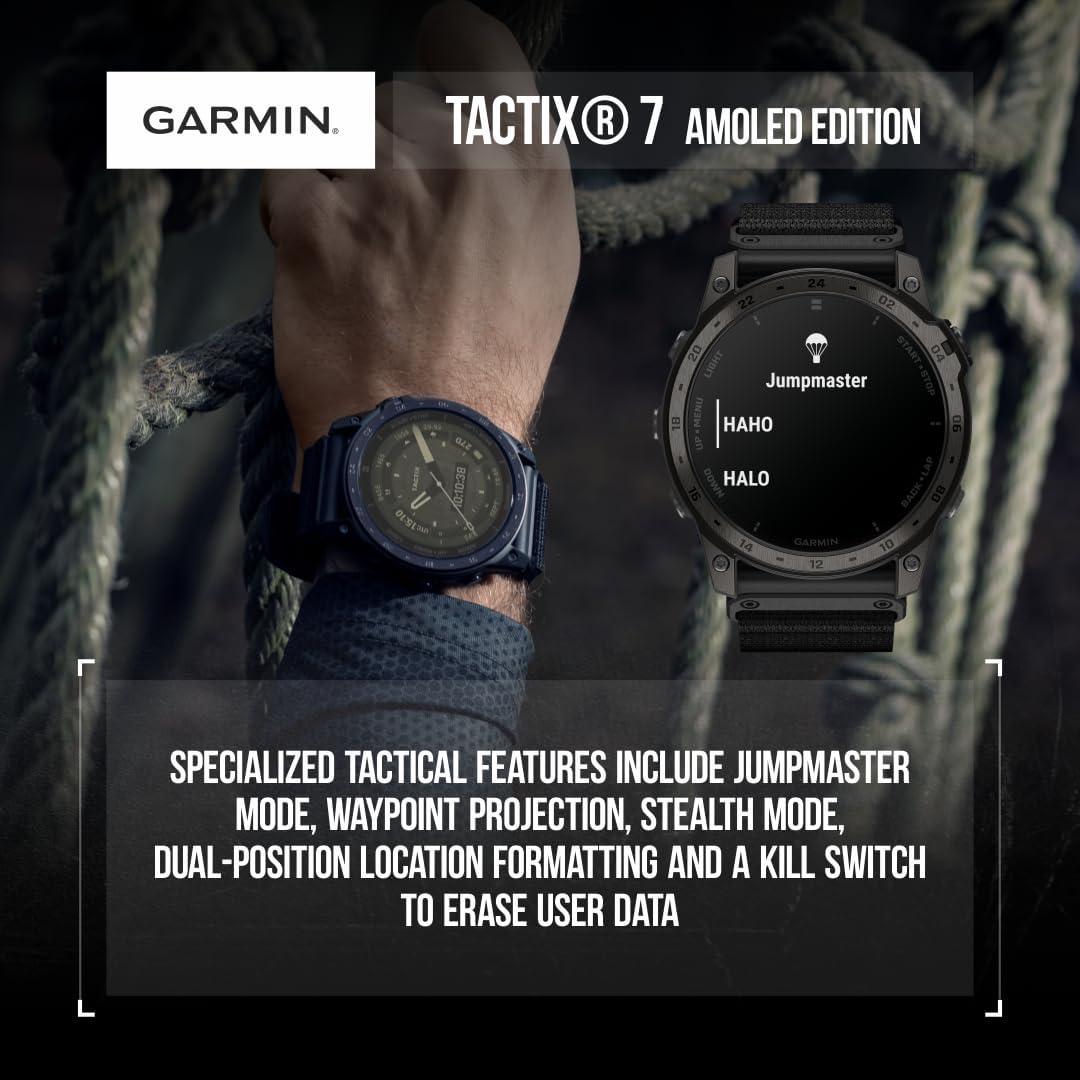 Garmin tactix 7 is the tactical multisport GPS smartwatch with traditional button controls and a touchscreen display. Featuring a rugged yet sophisticated design, tactix 7 has an always-on 1.4” display. Mission-ready tactical features include night vision compatible display, preloaded tactical and aviation features, dual-position GPS formatting, Jumpmaster mode, projected waypoints, stealth mode and kill switch. Navigate the harshest environments with elite navigation featuring preloaded TopoActive and ski maps plus multi-band and multi-GNSS support. The tactix 7 smartwatch also includes advanced training and performance tracking such as endurance and stamina, a new HIIT activity profile, comprehensive health and wellness monitoring, and everyday functionality with smart notifications (when paired with your compatible smartphone), Garmin Pay contactless payments (with a supported country and payment network) and more.