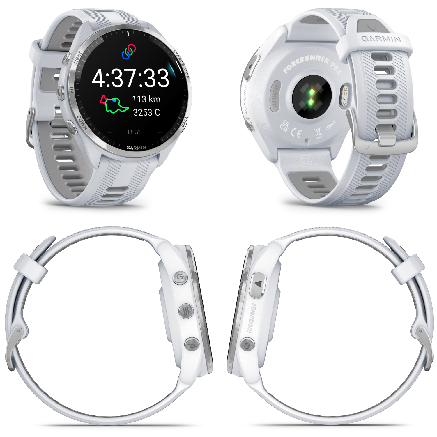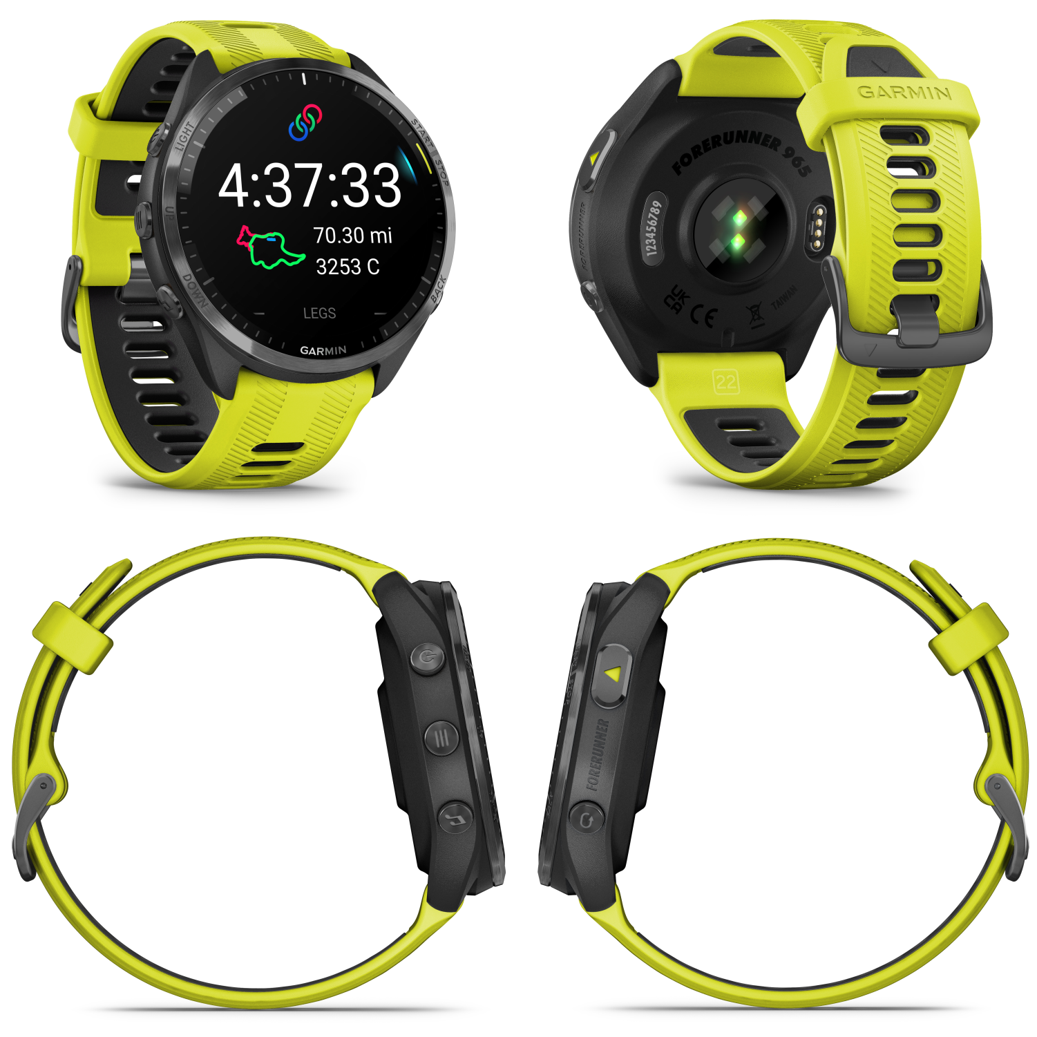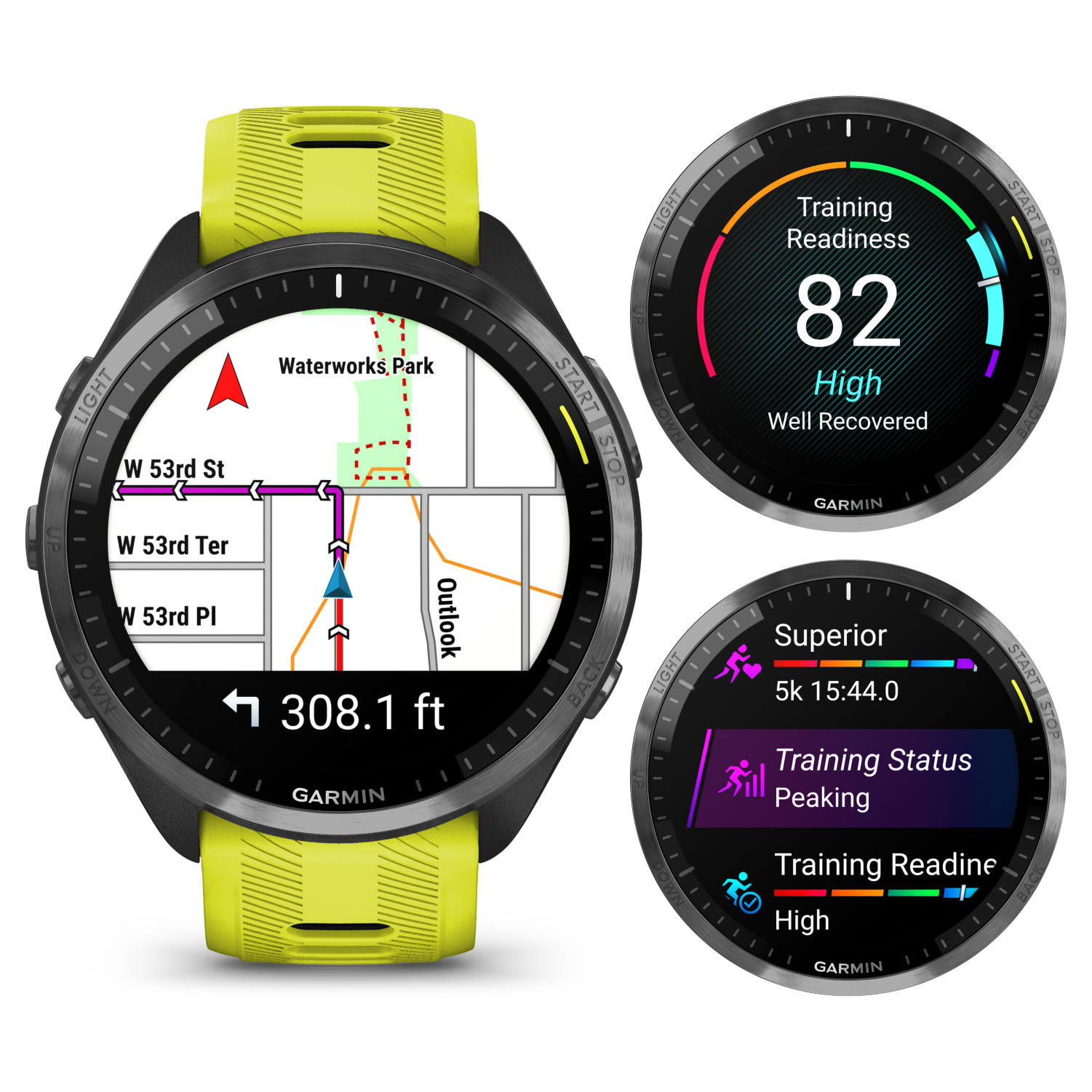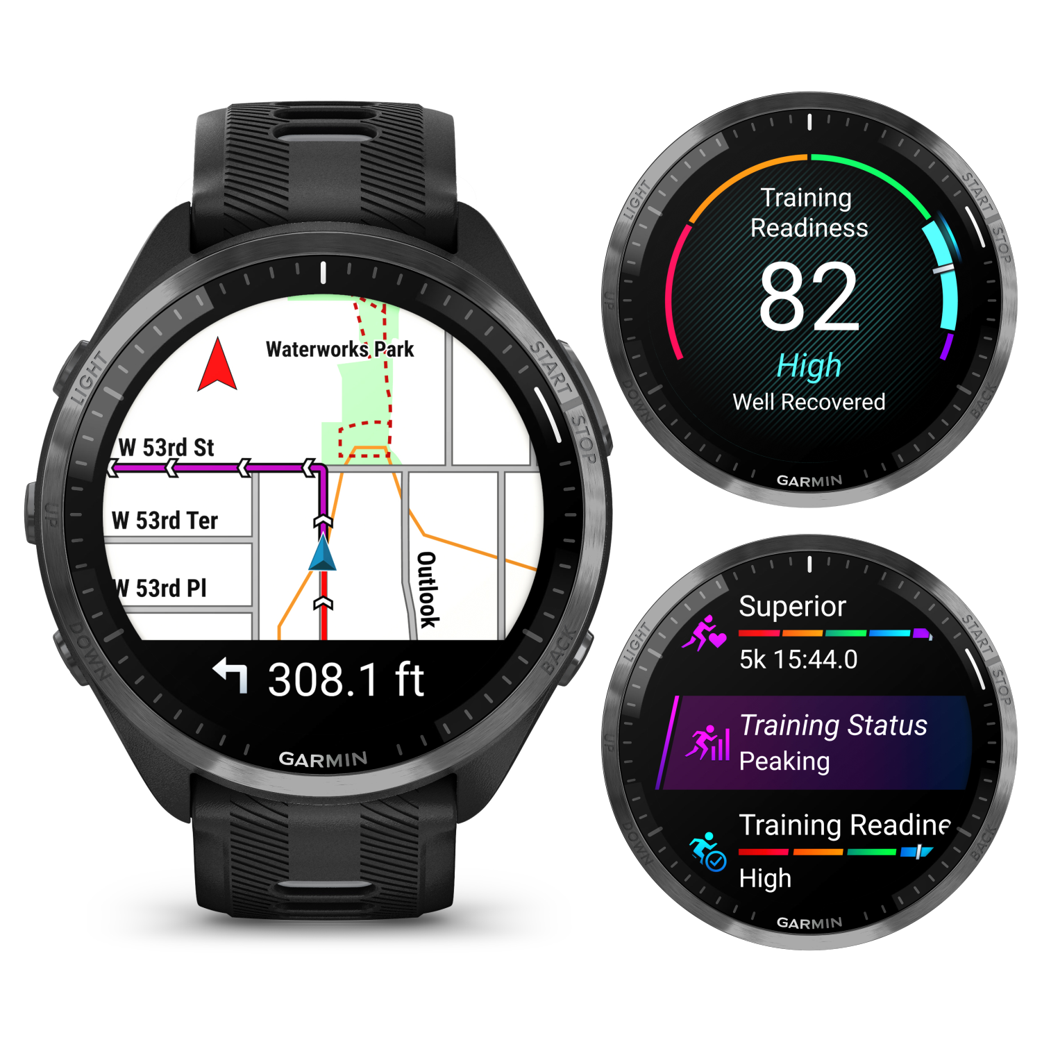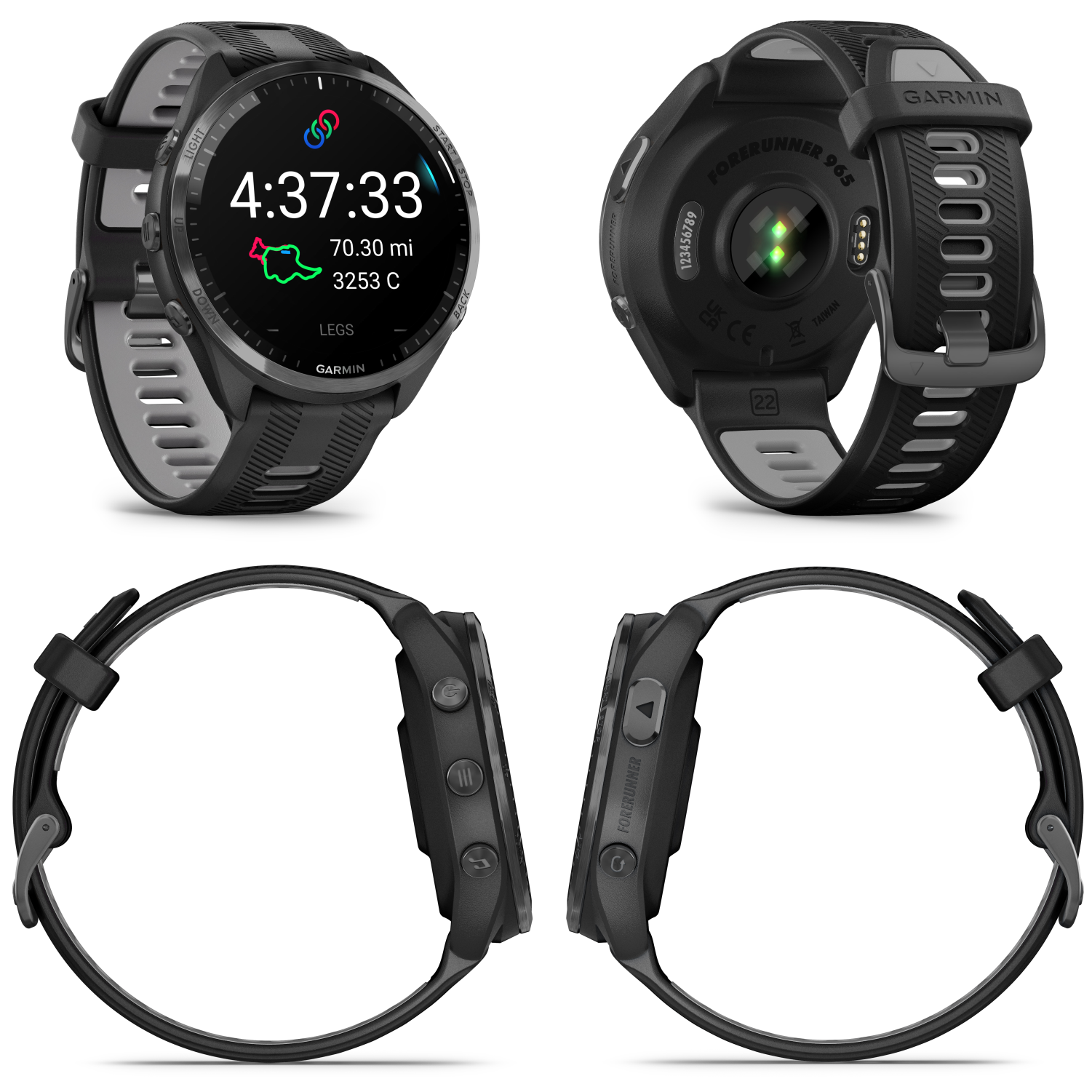 Train brilliantly with Forerunner 965, the premium GPS running and triathlon smartwatch with a bright AMOLED touchscreen display and lightweight titanium bezel. Wake up to your morning report with HRV status to see health insights with an overview of sleep, recovery and training outlook (data presented is intended to be a close estimation of metrics tracked). The training readiness feature tells you when you’re primed for a productive session — while daily suggested workouts adapt to performance and recovery alongside the race widget, which provides training tips, course details and completion time predictions. Navigate any route confidently with multi-band GPS and full-color, built-in maps. With traditional buttons and a touchscreen display, it’s easy to tap into your training status and know whether you’re training productively, peaking or strained. If you’re pushing to outshine the competition, the Forerunner 965 is there to light up every run with up to 23 days of battery life in smartwatch mode.