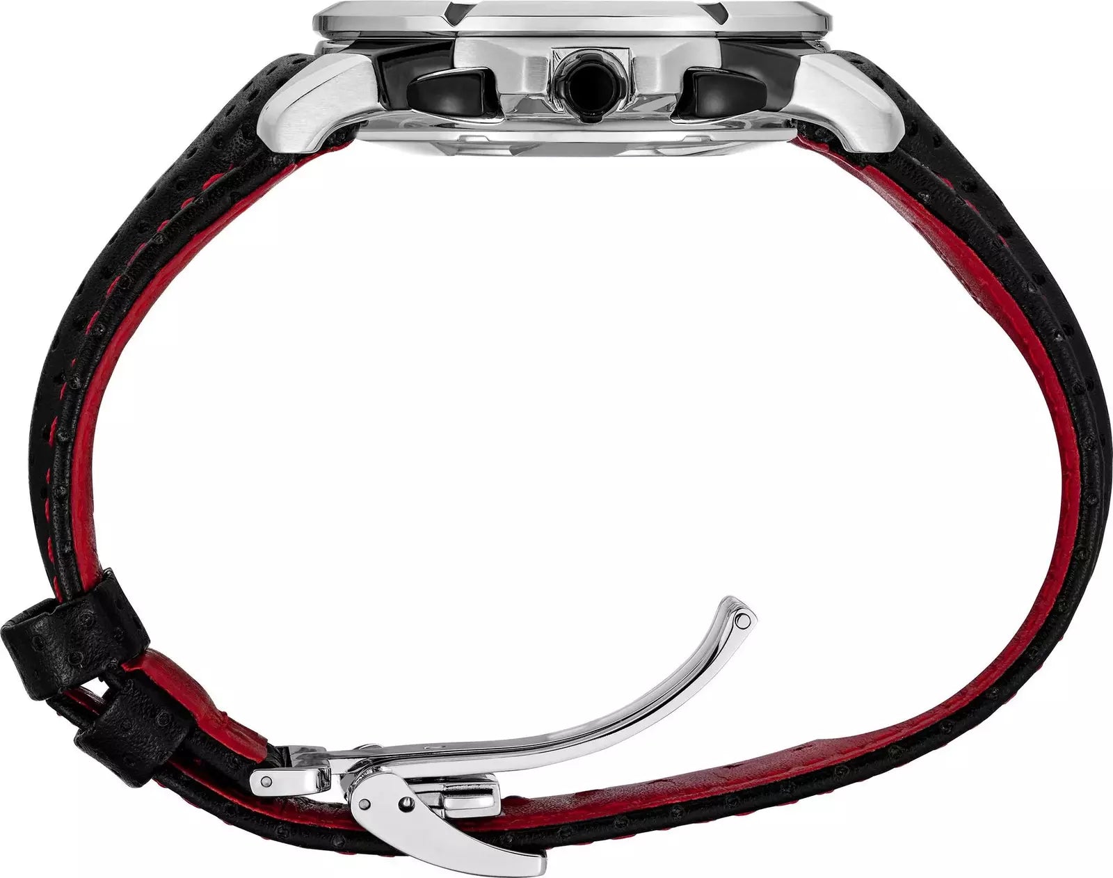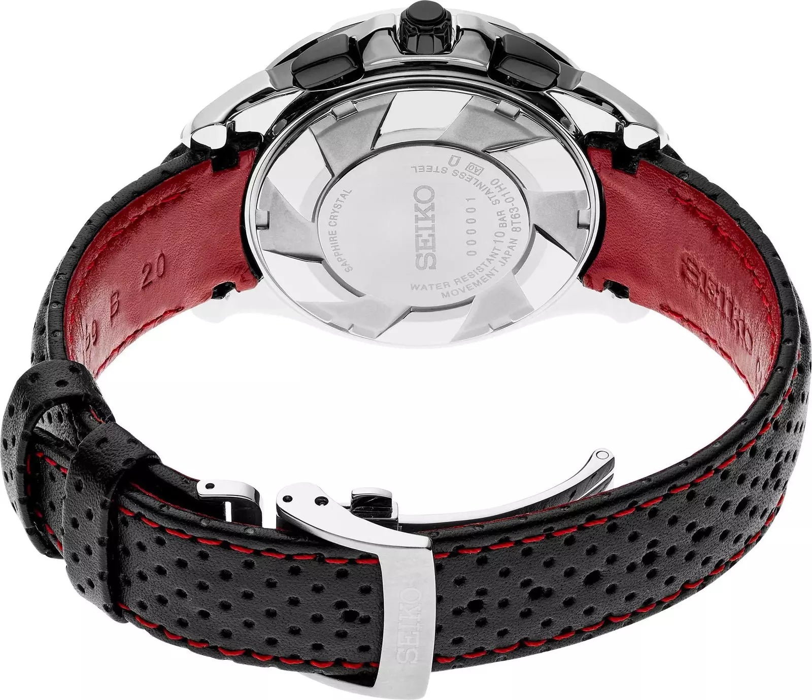• Black perforated leather strap with red contrast stitching suggesting vintage driving gloves