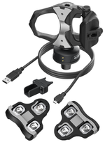 Right pedal with integrated power sensor, plus micro-USB cable and magnetic connector for charging.
