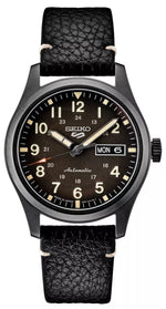 Seiko 5 Sports. Inspired by classic field/military design, this stylishly retro watch offers authentic lines with both durability and all-day excellence. Providing automatic technology that you control with every movement, this versatile watch is powered by a 24-jewel movement that beats at a frequency of 21,600 vibrations per hour, with a power reserve of approximately 41 hours and manual winding capability. The black dial features Arabic numerals, a day/date calendar, red-orange tipped second hand, and beige luminous hands and markers. Crafted of stainless steel with black ion finish, this unique watch includes a black leather strap with contrast stitching, and a screwdown see-through caseback for a view of classic timekeeping in action. 10 bar, 100M Water Resistant