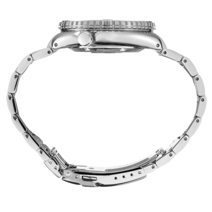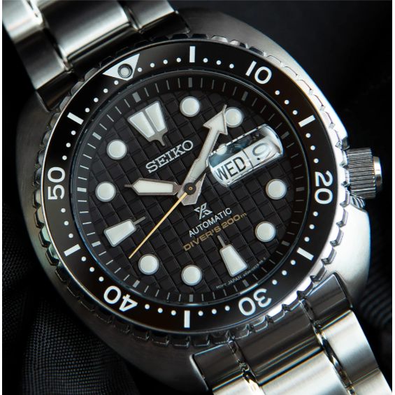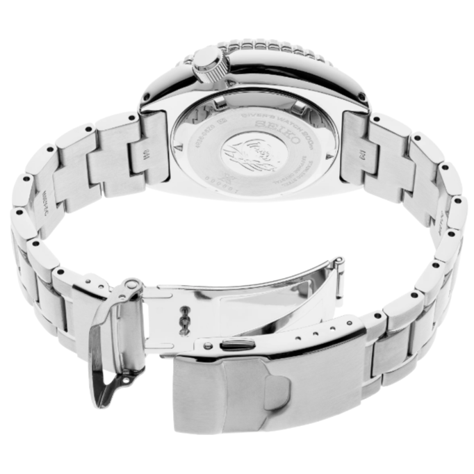 Prospex Automatic Diver. Designed for those who treat life as the ultimate adventure, the Seiko Prospex line meets every challenge with technological excellence and winning design. Upgrading an iconic style with a ceramic bezel and a sapphire crystal with anti-reflective coating on the inner surface, this rugged, yet distinctive, timepiece offers a three-dimensional pressed pattern on the rich black dial, mirroring the shape of the bezel edge. LumiBrite hands and markers, and a magnified day/date window ensure legibility in rough conditions. The 24-jewel automatic movement beats at a frequency of 21,600 vibrations per hour, with a power reserve of approximately 41 hours, and can be wound manually or automatically. In stainless steel, with black ceramic one-way rotating elapsed timing bezel, secure screwdown crown and caseback, this high-intensity watch follows ISO standards for scuba diving. 200m Water Resistant