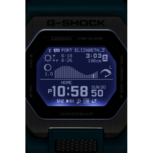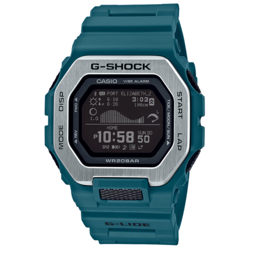 The new GBX100 models are the latest additions to the G-LIDE lineup of G-SHOCK sports watches, which are a favorite choice among the world's top surfers. These new models come with the ability to display information required by surfers (high tide and low tide times and levels), and to use a phone application for simple selection of one of approximately 3,300 locations around the globe. The wide face and a high-definition MIP (Memory In Pixel) LCD improves display readability of standard functions like Tide Graph, Moon Data, high tide and low tide times, and sunrise and sunset times. This provides important information about current conditions at a glance, which, in combination with a collection of training measurement functions (distance, speed, pace, lap, pitch), provides plenty of support for surfers who meet new challenges around the globe. In addition to powerful functions, these new models also incorporate advances in design, structure, and materials. The bezels of these models are made of resin and metal to allow them to withstand the impact of underwater rocks better.