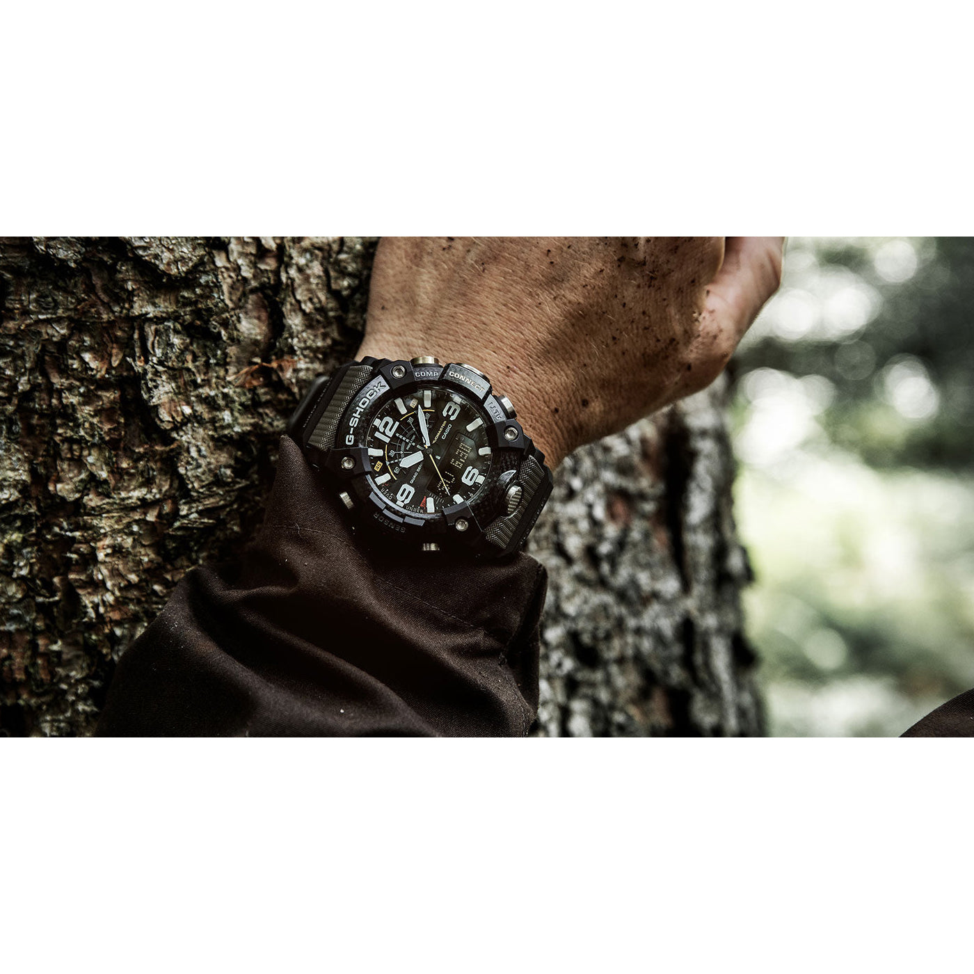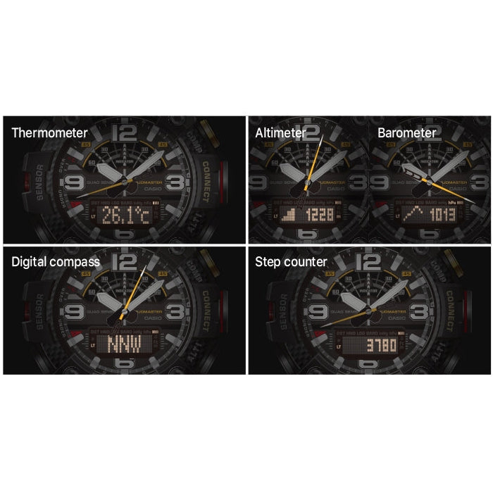 From the MASTER OF G Series MUDMASTER, the watch that is designed and engineered to withstand rough land environments, come carbon resin models that incorporate a new type of structure. The case is made of high-rigidity carbon material to protect against damage and deformation due to impact and other rough treatment, while metal button pipes ensure a tighter seal against the external environment. A filter further protects against the invasion of mud, for the high level of dust and mud resistance required when in severe environments. In addition, the dual back cover consists of a stainless steel panel back and an outer cover made of shock resistant fine resin embedded with glass fibers. Quad Sensor capabilities use compact sensors that make it possible to pack compass, altitude/barometer, and temperature measurements, along with an accelerometer that keeps track of your step count, into a compact configuration. A special G-SHOCK app, which simplifies configuration of watch settings, also includes a new Mission Function.