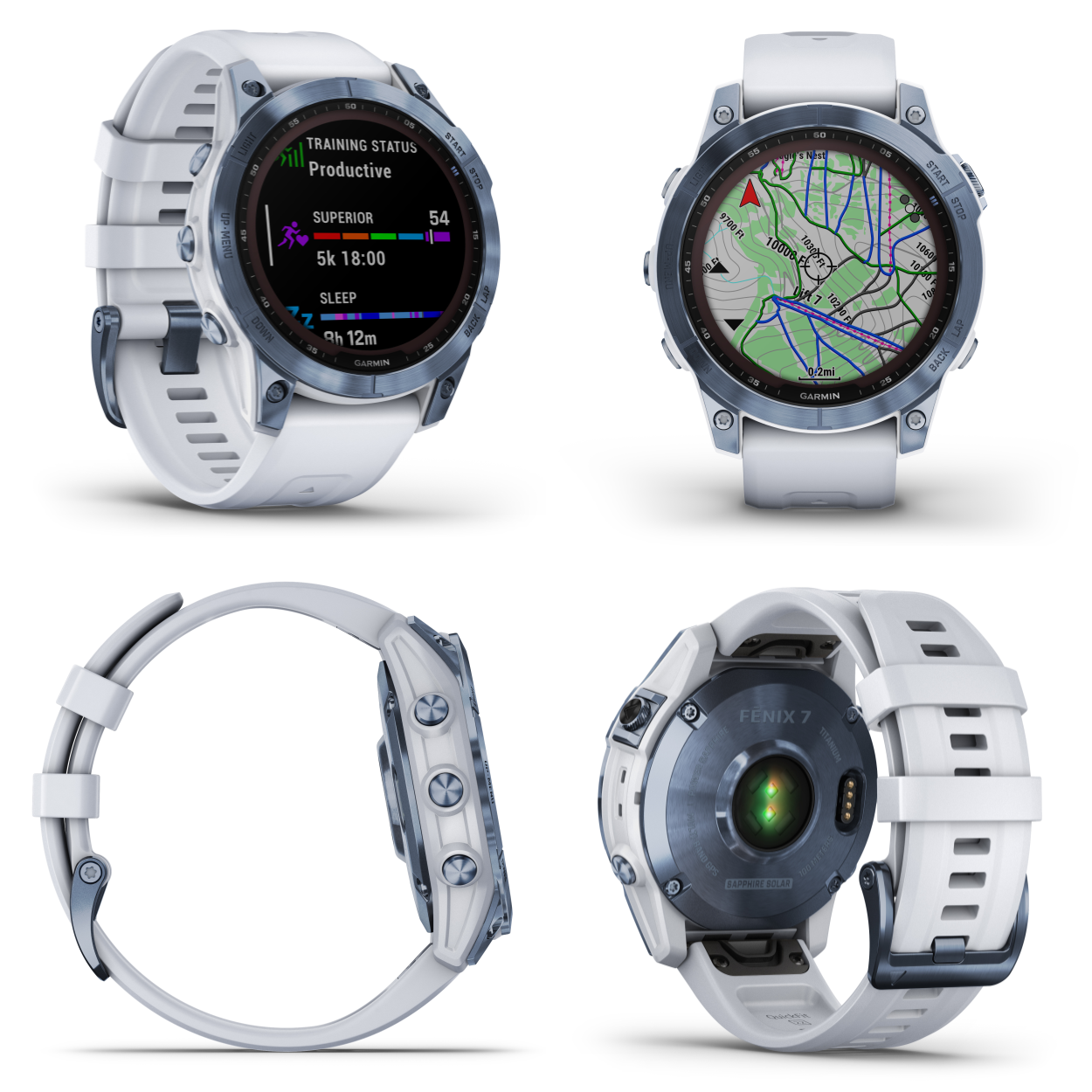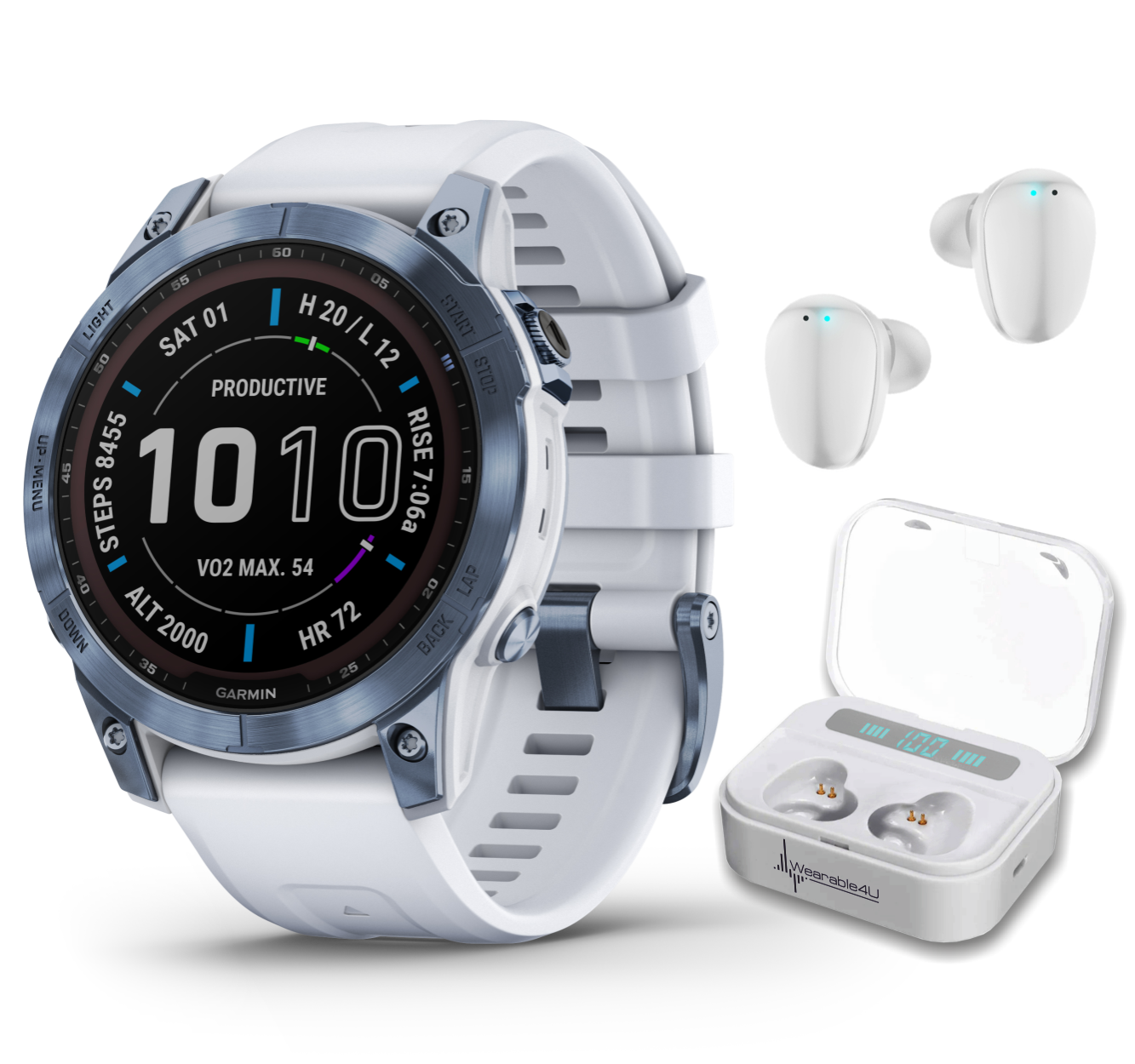- Fenix 7 / Sapphire Solar - Mineral Blue DLC Titanium / '+ White EarBuds