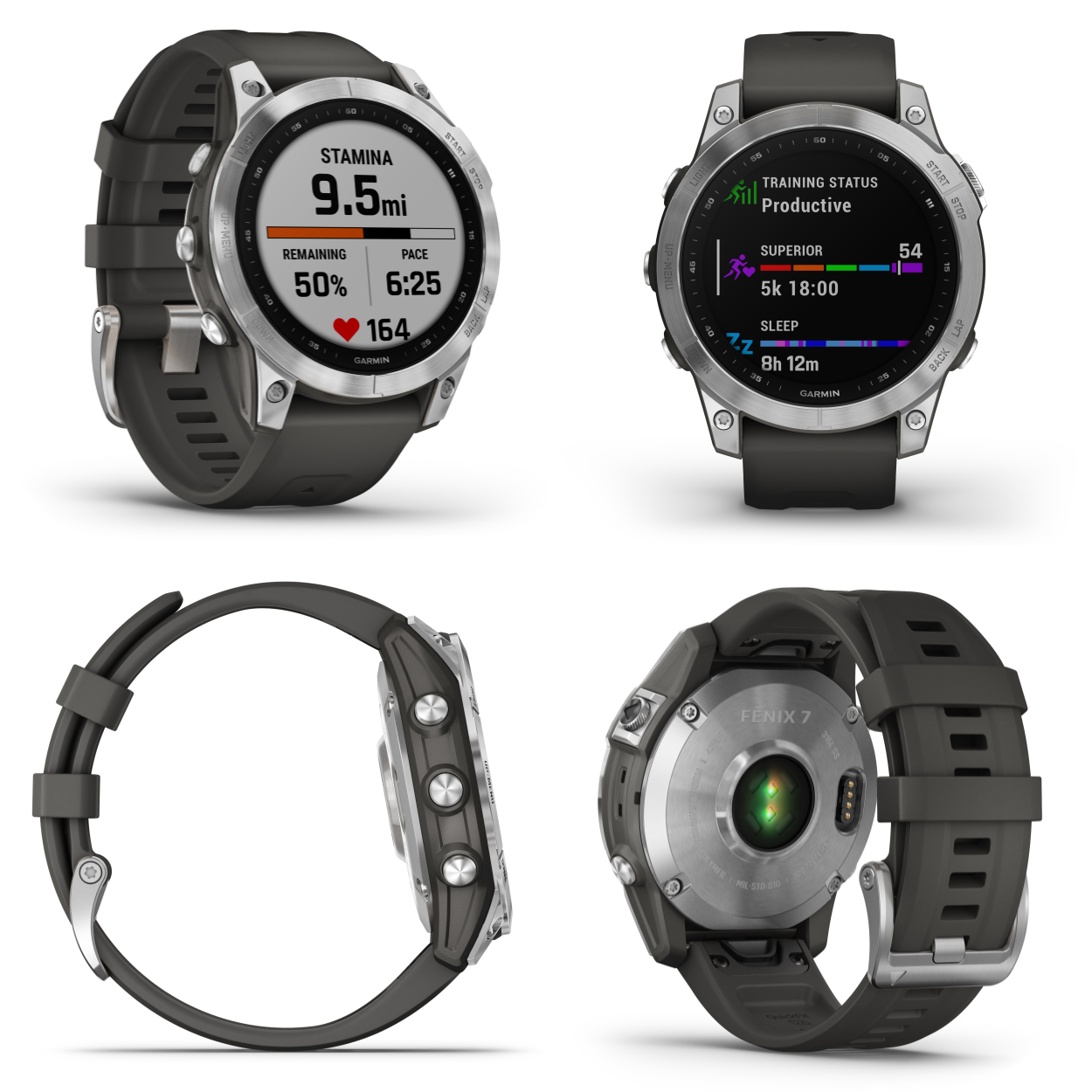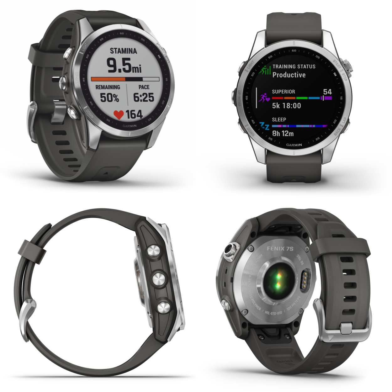 There are 7 days in a week. And the fēnix 7 Series multisport GPS watch is built to go strong for all of them. It’s styled for smaller-sized wrists. Use trusted button controls or the new touchscreen interface to access selections. Gain performance insights and metrics that help you manage your exertion and build stamina. Optimize recovery with 24/7 health and wellness monitoring of heart rate, respiration, stress, sleep and more (this device is intended to give an estimation of your activity and metrics; it is not a medical device). GPS and outdoor navigation sensors guide your outings off the beaten path. And to complement your tamer days, connected features include smart notifications when connected to a compatible smartphone, music storage and Garmin Pay contactless payments in supported countries and payment networks.