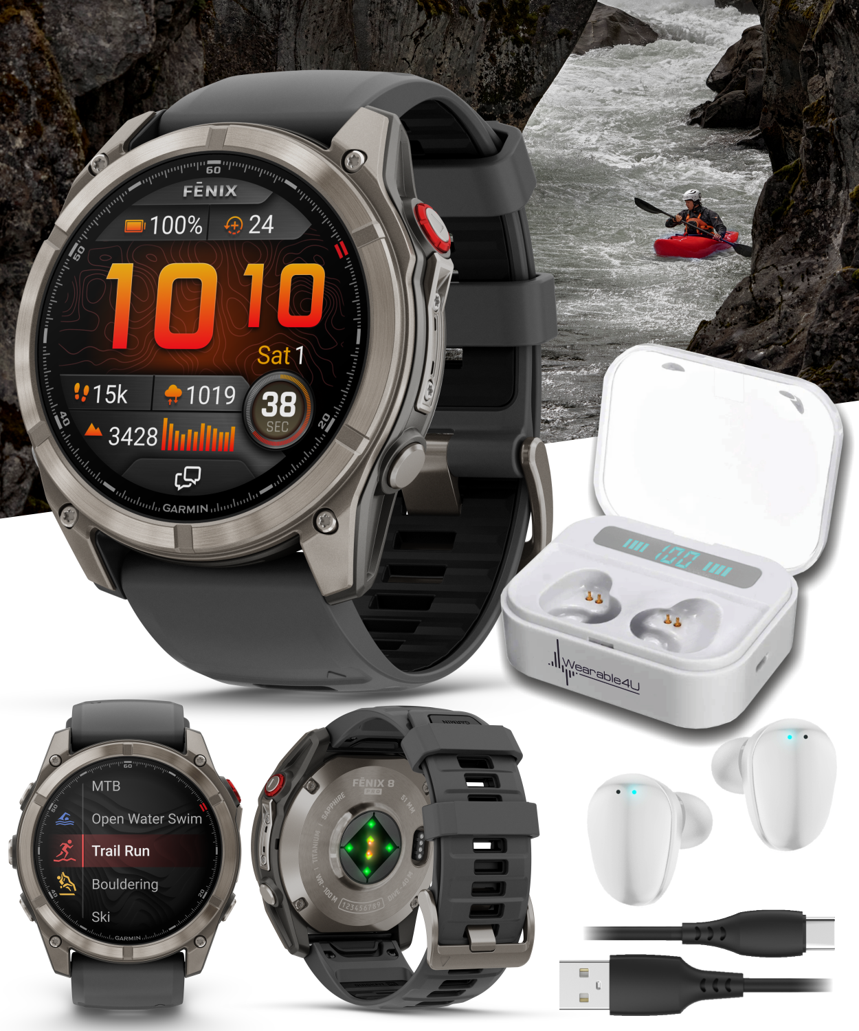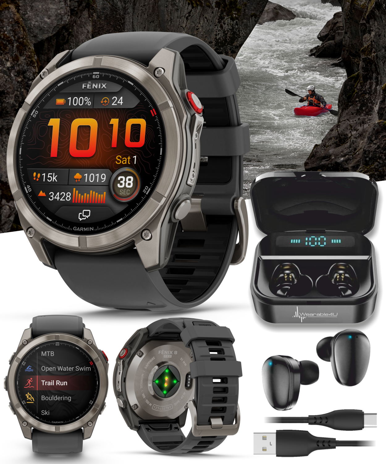 - IN THE BOX (Bundle Options): 1x Garmin Fenix 8 Pro Smartwatch; 1x charging/data cable; documentation; Wearable4U PowerBank or Wearable4U Black EarBuds or Wearable4U White EarBuds
