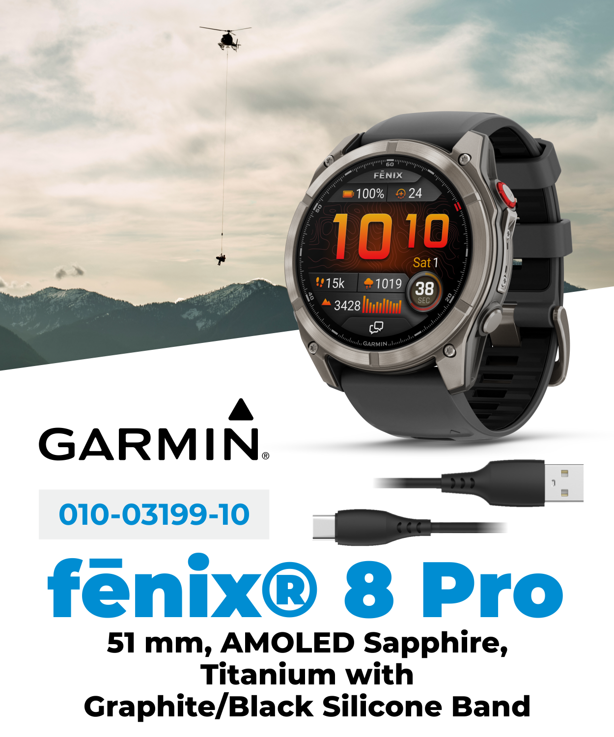 - IN THE BOX: 1x Garmin Fenix 8 Pro Smartwatch; 1x charging/data cable; documentation