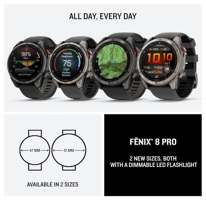 The fenix 8 Pro is available in two sizes (47 mm and 51 mm) and two premium color options: Carbon Gray DLC Titanium with Black/Pebble Gray Silicone Band, and Titanium with Graphite/Black Silicone Band. Bundle editions are also available with Wearable4U Power Bank, Wearable4U Black EarBuds, or Wearable4U White EarBuds. Choose your bundle option and enjoy the ultimate smartwatch experience!