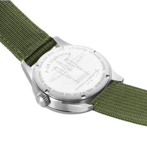 The Luminox P-38 LIGHTNING with a 42 mm black dial and sapphire crystal comes with a flexible green textile strap with Luminox signature buckle. The GMT function for dual timezones makes it a must-have for any worldwide traveler. A nod to the traditional B-Uhr navigation watch of the 1940's, just below the 12 o'clock is an upwardly pointing triangle with two dots, providing quick orientation and the ability to read the time at a glance.