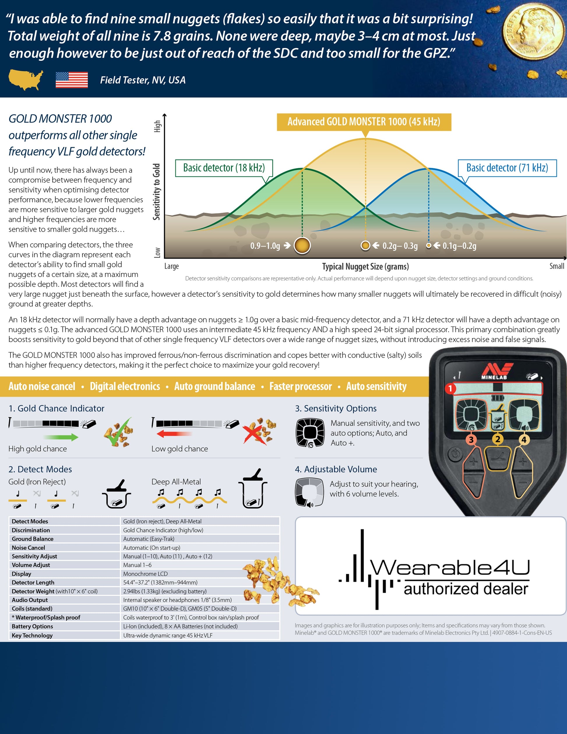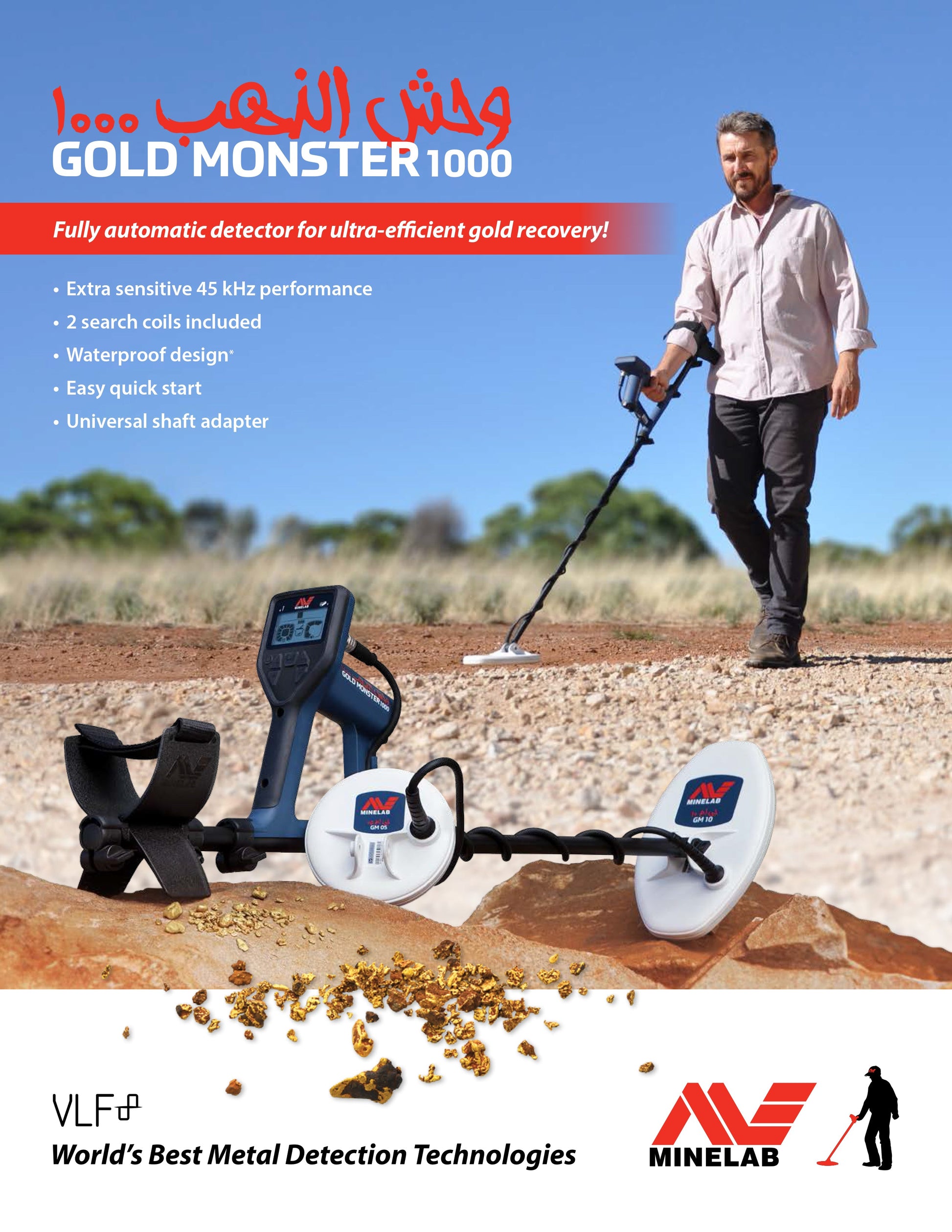 The GOLD MONSTER 1000 has improved ferrous/non-ferrous discrimination and copes better with conductive (salty) soils than higher frequency detectors, making it the perfect choice to maximize your gold recovery!