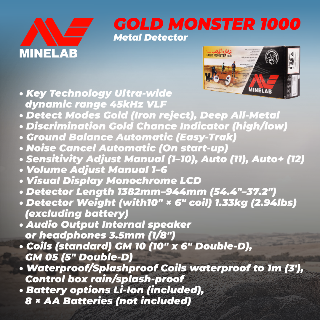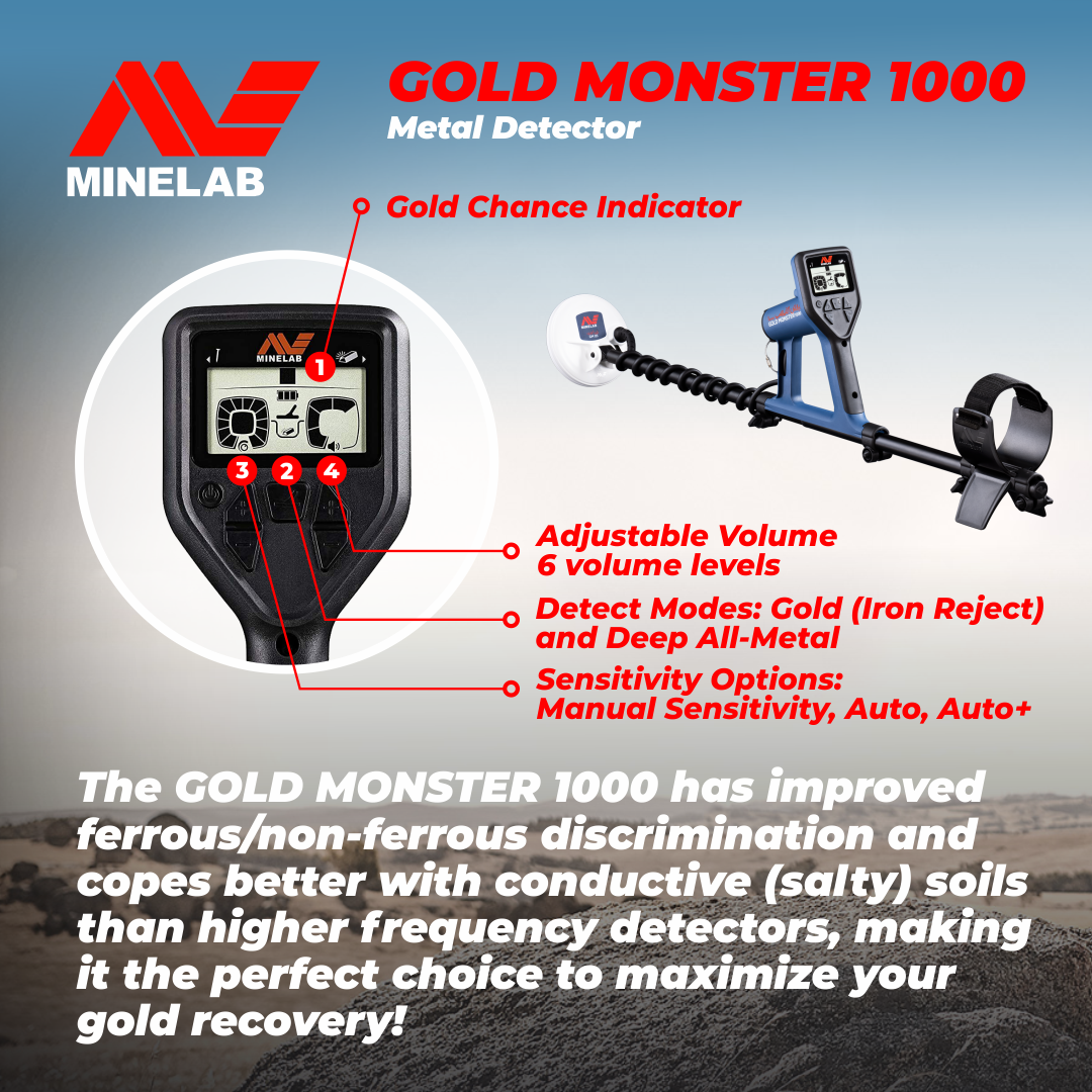 The GOLD MONSTER 1000 also has improved ferrous/non-ferrous discrimination and copes better with conductive (salty) soils than higher frequency detectors, making it the perfect choice to maximise your gold recovery.