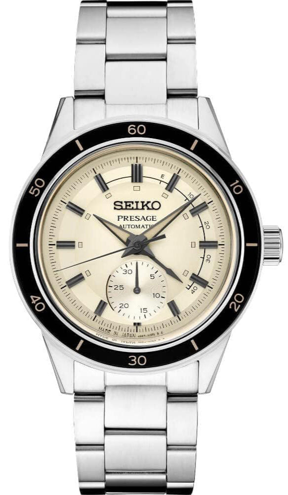 Presage Style ’60s Collection. Offering the finest in Japanese mechanical watchmaking, the Presage Collection blends precision technology with superior craftsmanship and design. With broad angular lines and such vintage details as box-shaped crystals, faceted indices and sharp hand design, plus the use of neutrals and earth tones, the Style ’60s collection creates a warm, retro feel. Celebrating the fresh spirit of the 1960s, the collection takes particular inspiration from Seiko’s 1964 “Crown Chronograph,” Japan’s first watch with a stopwatch function. Framed by a black bezel, the ivory dial features power reserve and date displays, as well as LumiBrite hands and markers. The screwdown see-through caseback provides a view of the 29-jewel movement with manual winding capability, a frequency of 21,600 vibrations per hour and a power reserve of approximately 41 hours. Crafted of stainless steel, this exceptional timepiece includes a box-shaped crystal and tri-fold push button release clasp. 5 bar, 50M Water Resistant